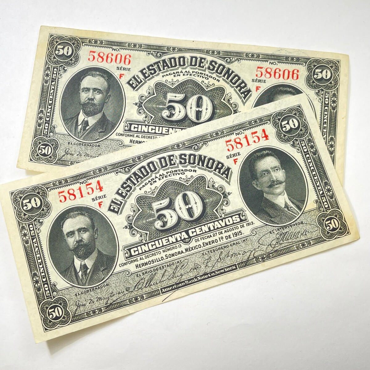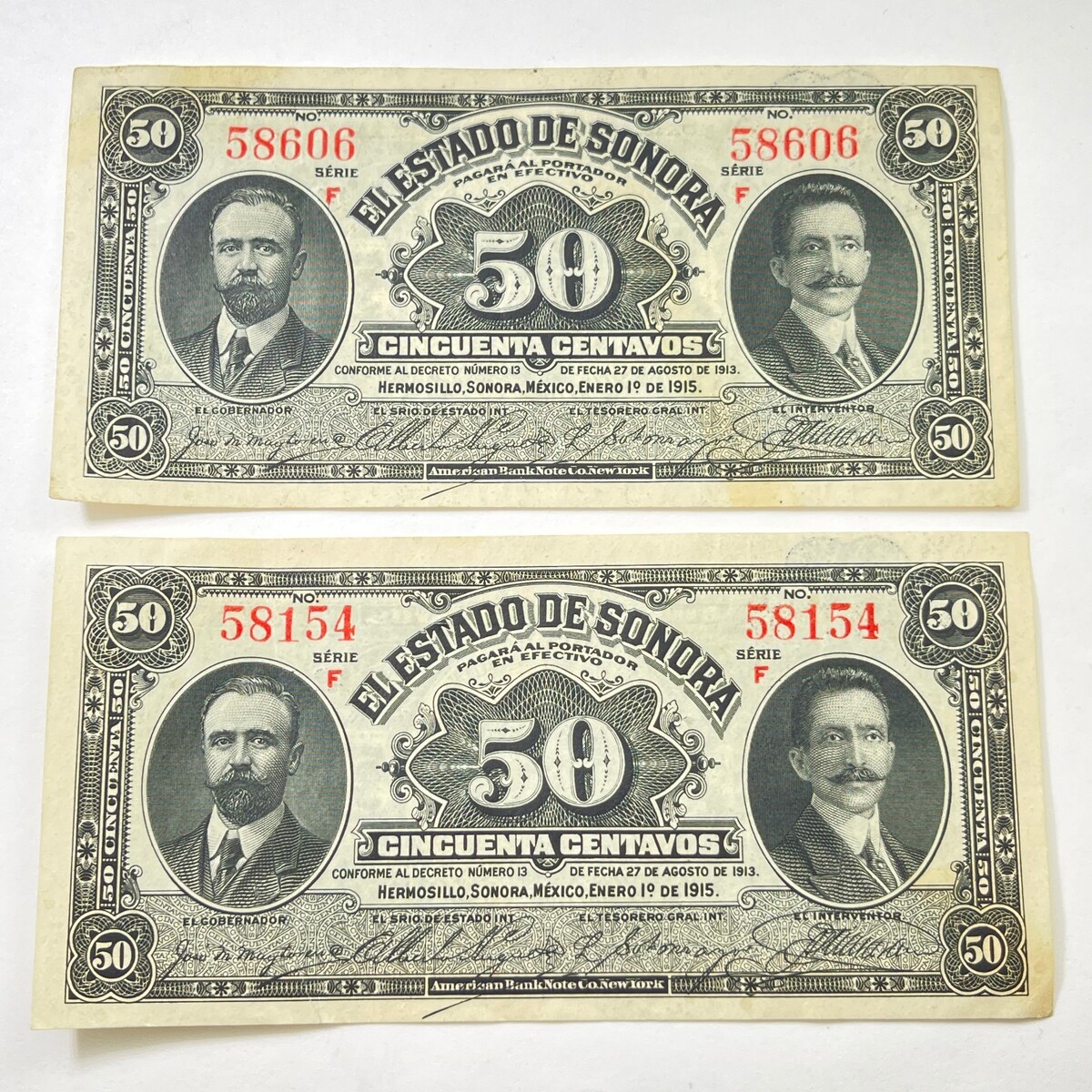 Lotto di 2 1915 Estado de Sonora Messico 50 Centavos Note AU+ P #S1070