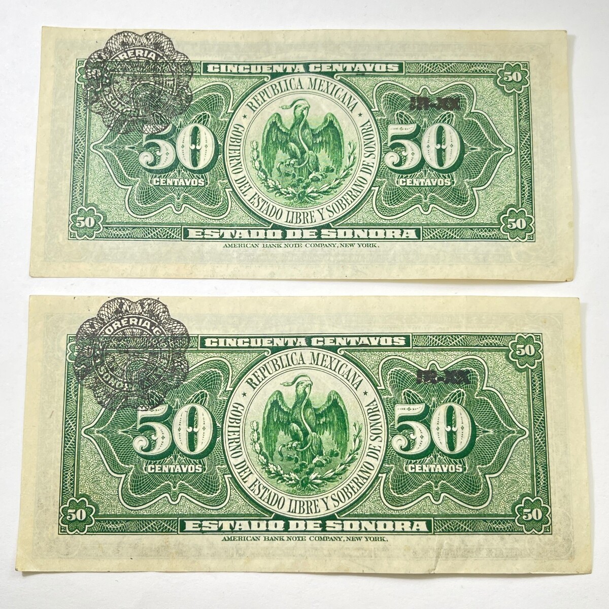 Lotto Di 2 Banconote 50 Centavos Estado De Sonora Messico AU+ P #S1070