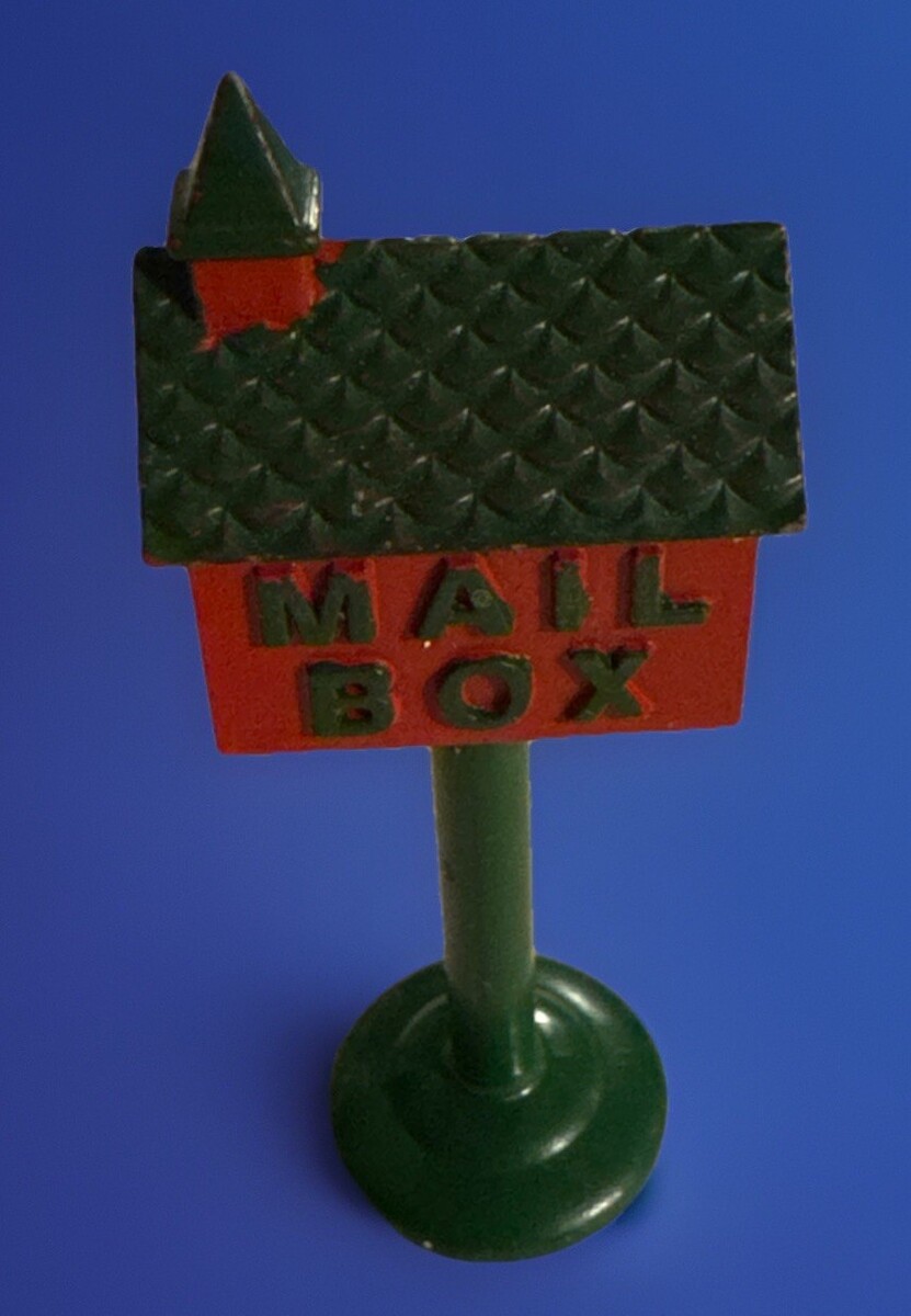 This miniature red mailbox with a green roof is designed specifically for holiday display villages. Crafted from metal, this unique piece adds a festive touch to any collection of decorative figurines. Its vibrant red color and miniature size make it a charming addition to a holiday display, perfect for bringing a touch of whimsy to a festive scene. This intricately designed mailbox is sure to delight collectors and add a touch of holiday cheer to any display village.