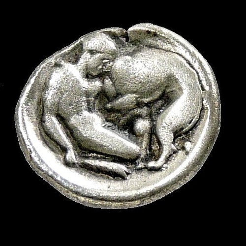 Reverse: depicts the first of the Twelve labors of Herakles ~ Herakles kneeling right on right leg, holding club with right hand, strangling the Nemean