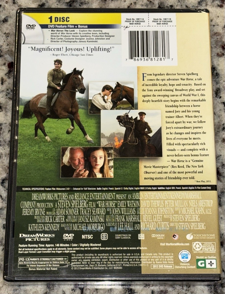 The "War Horse" DVD directed by Steven Spielberg is a brand new, sealed product that offers a realistic war drama experience.