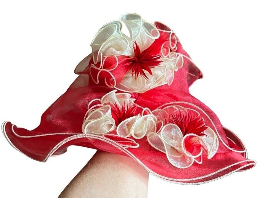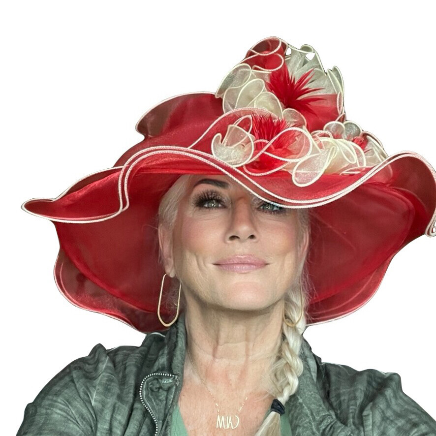Exquisite Red and Ivory Organza Wide Brim Hat For Kentucky Derby Festivities, Wedding, Evening Or Cocktail Party And Let's Not Forget The Red Hatter Ladies