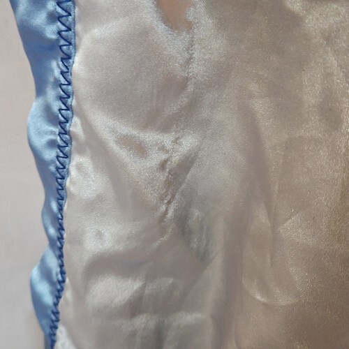 Blue velour and satin blanket with embroidered "thank heaven for little boys" and attached little dog plush torso