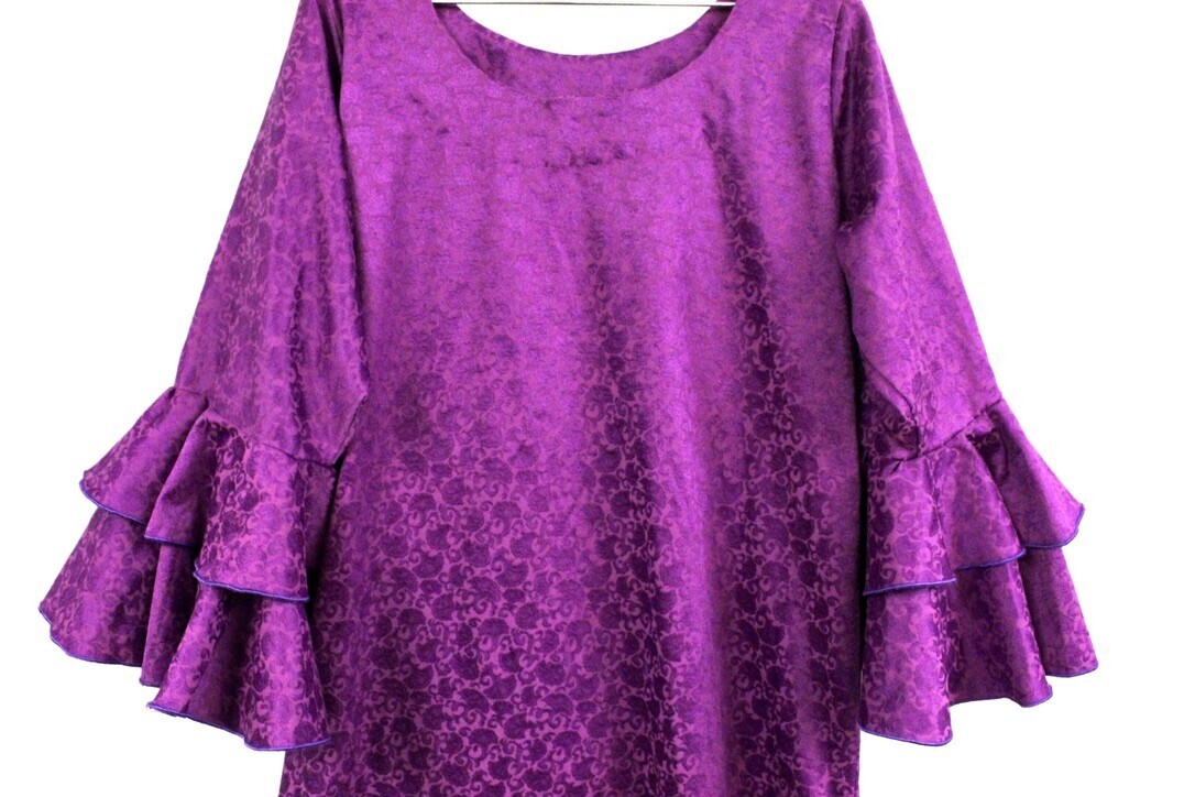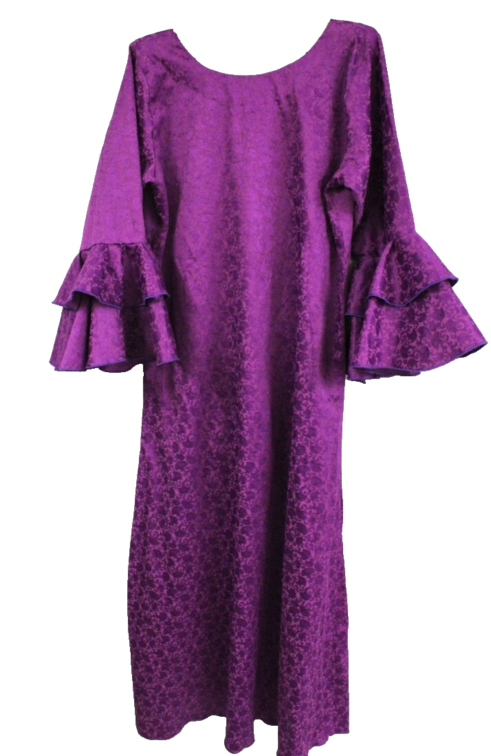 Vintage 1970s Violet Cotton Damask Floor Length Gown Ruffle Sleeve Finland L