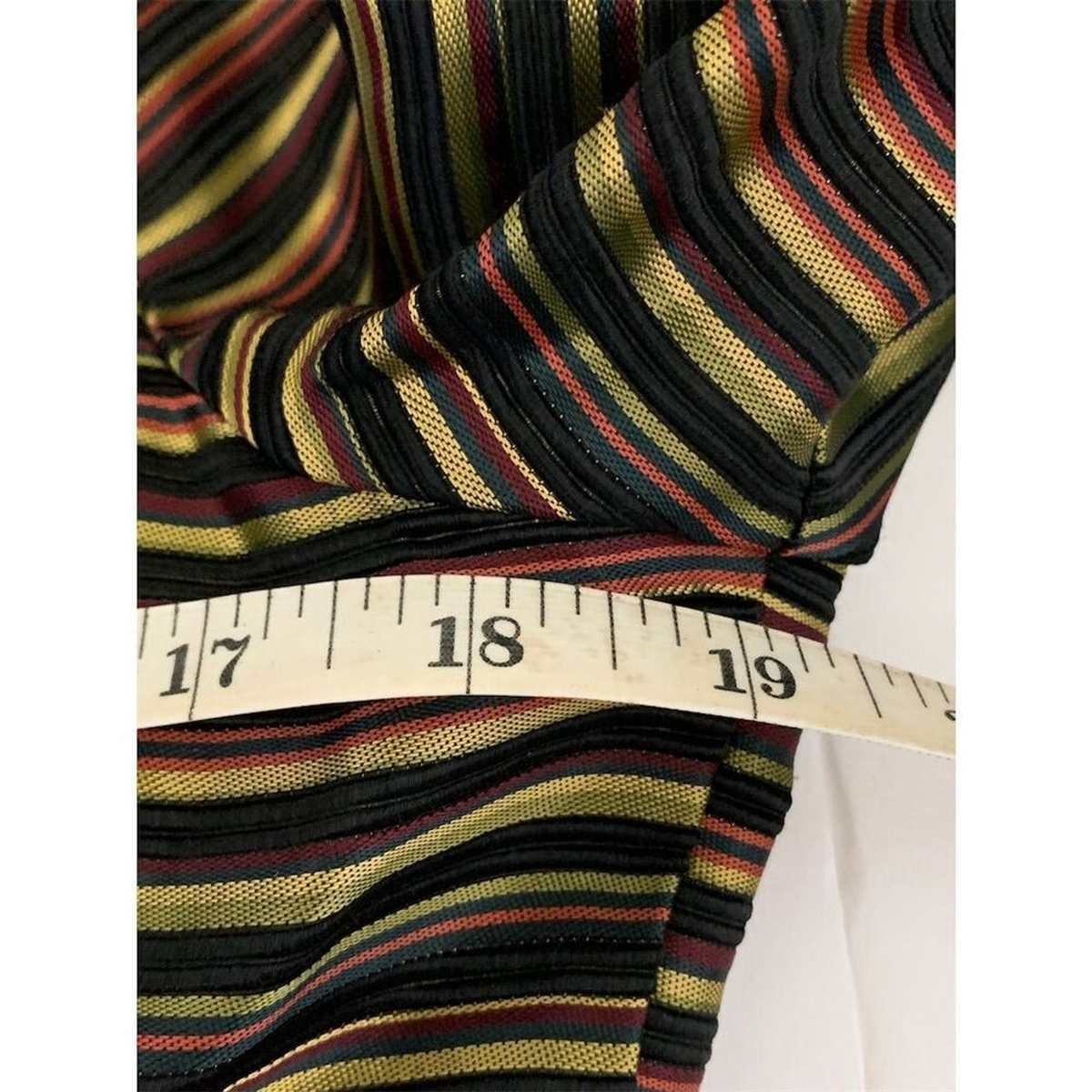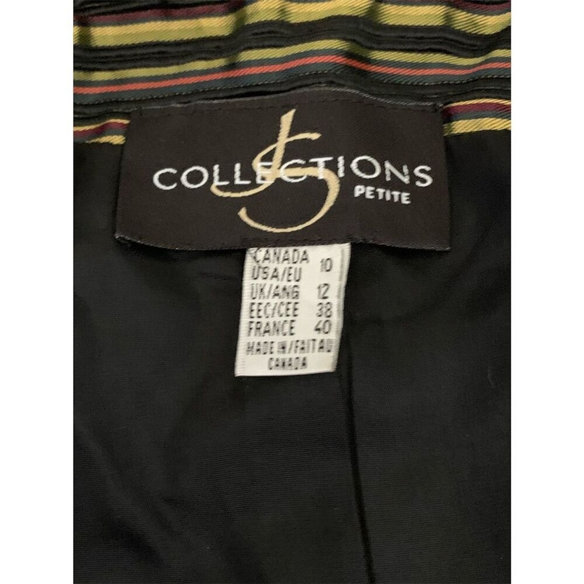 Keywords: JS Collections, petite blazer, vintage style, elegant jacket, multicolor blazer, velvet accents, button-up blazer, striped pattern, women's fashion, size 10, office wear, dinner jacket, pre-owned blazer, fully lined, sophisticated style.
