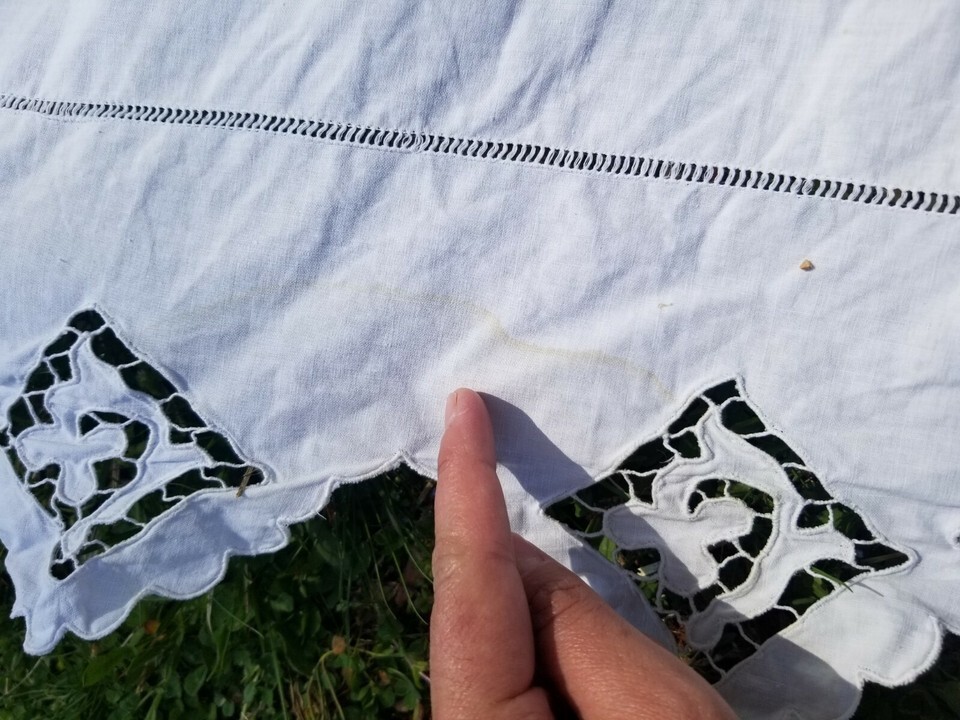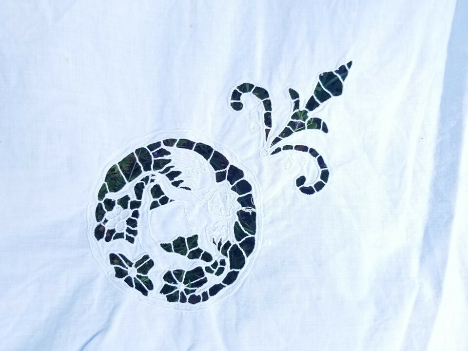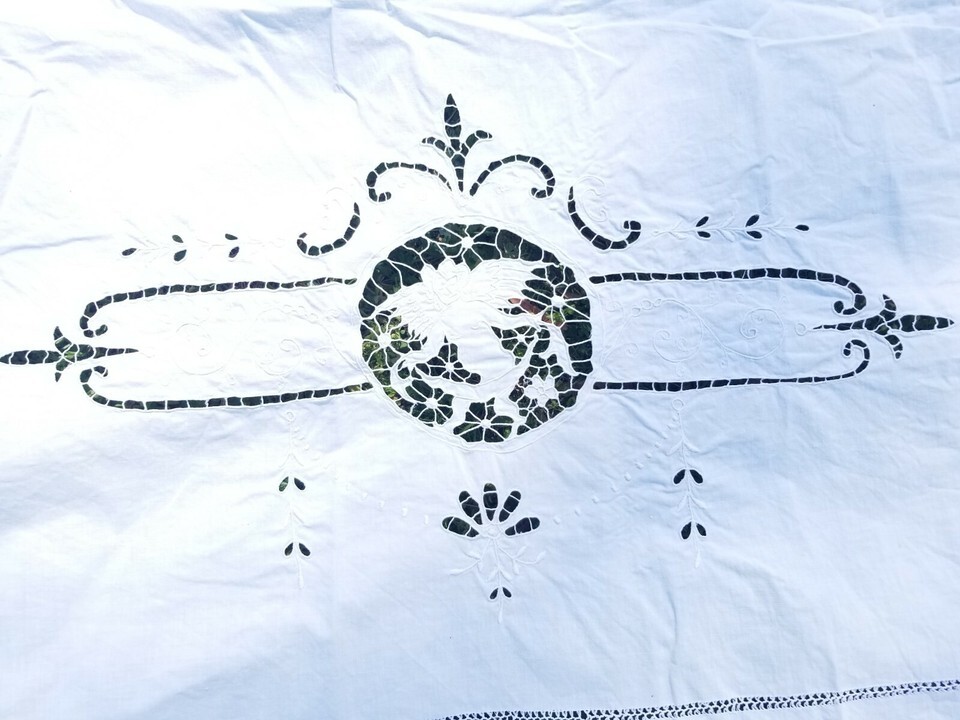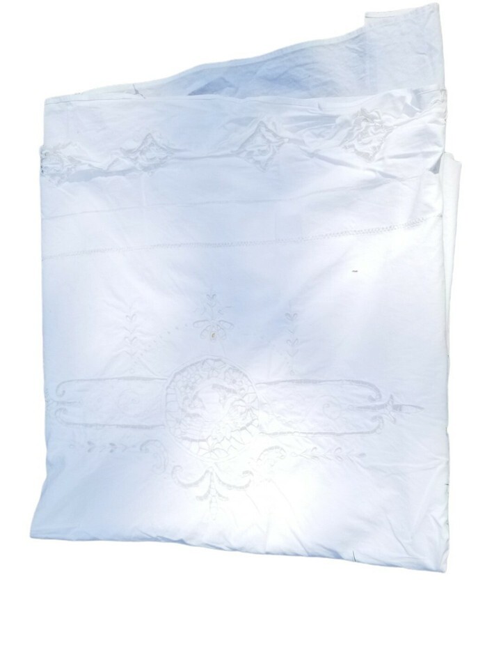 Antique Italian Boho White Cut Work Cherub Cameo Lay Over Sheet Cover 98"x 87"