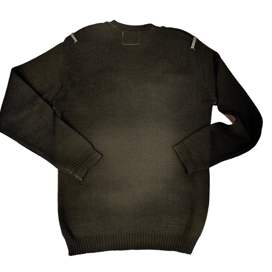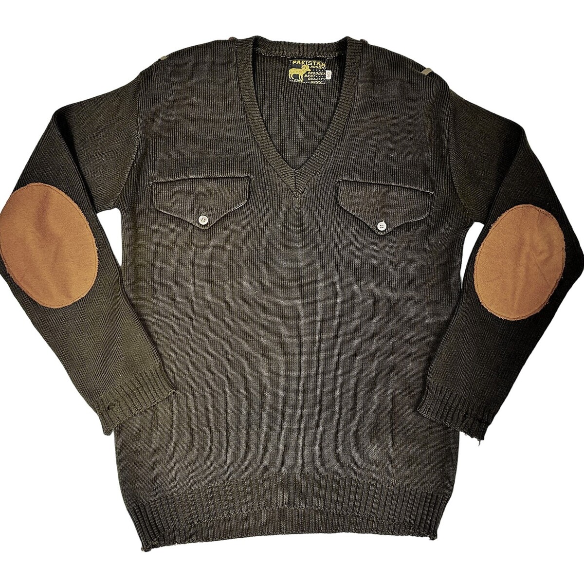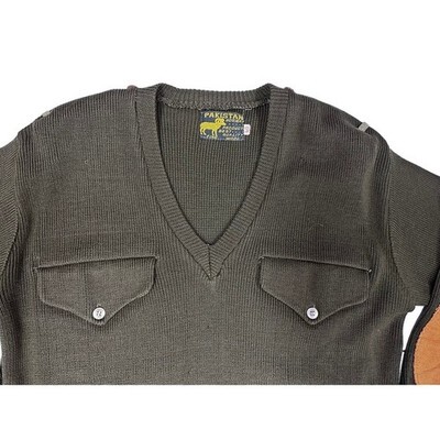 Authentic vintage wool sweater by Pakistan Hosiery, size 40, in army green. Features two chest pockets, soft flannel elbow patches (not leather), elastic waist and cuffs for a structured military fit. A classic utilitarian piece with rugged styling, perfect for collectors and modern workwear fans.
