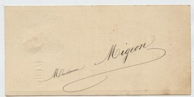Measures about 3 1/4" x 7" with a name written in beautiful calligraphy on the back . 1906 French Restaurant Embossed Menu Card Madame Migeon