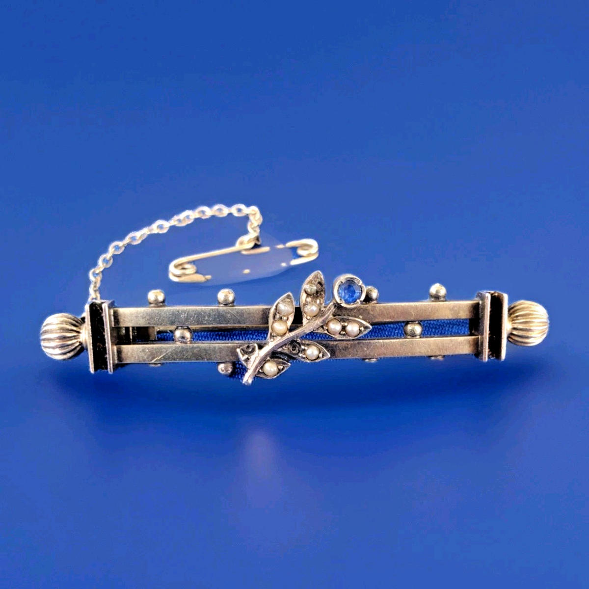 Original Victorian Sapphire Pearl 9 Karat Gold Brooch Pin.