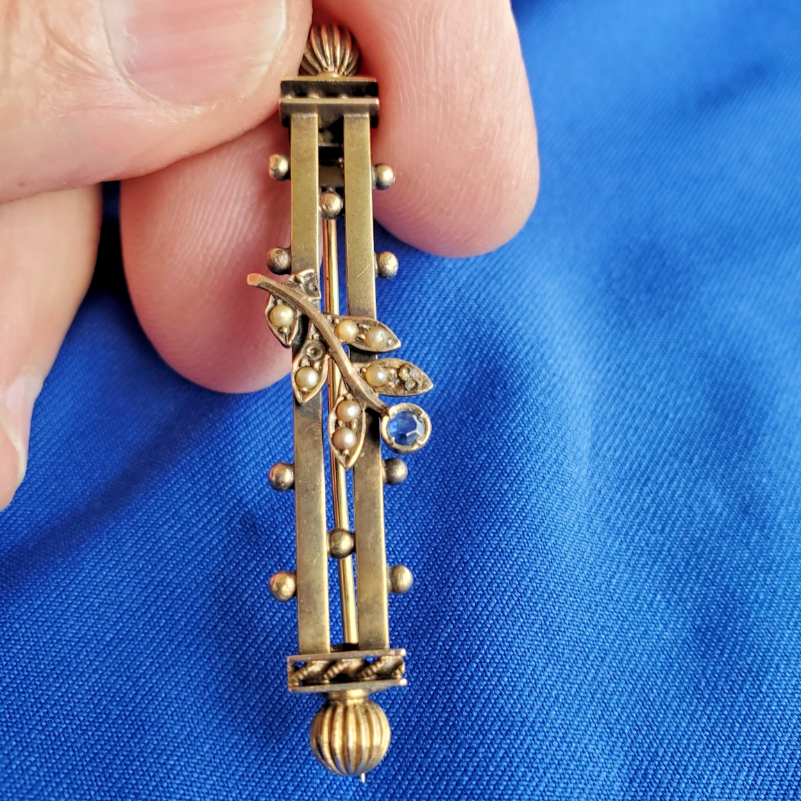 ORIGINAL VICTORIAN SAPPHIRE PEARL BROOCH 9K GOLD 4.2 GRAMS 2" INCH Deco Vintage