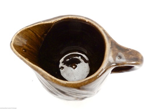Shiny brown glazed angel fish pitcher measuring about 6" tall. It was produced between 1930 - 1940.