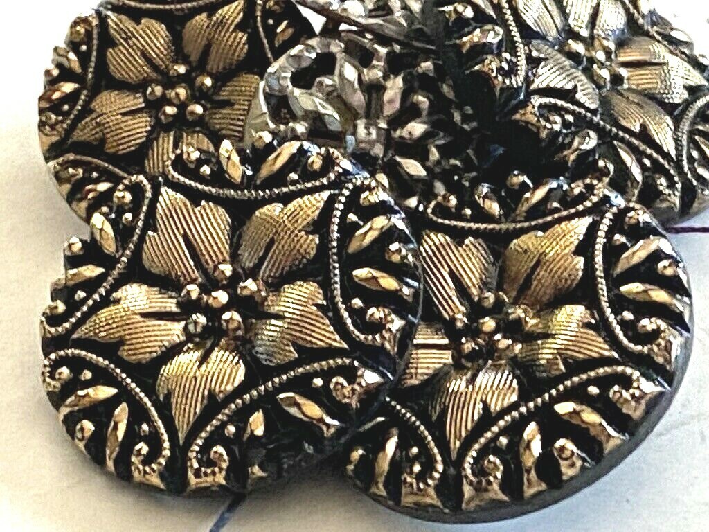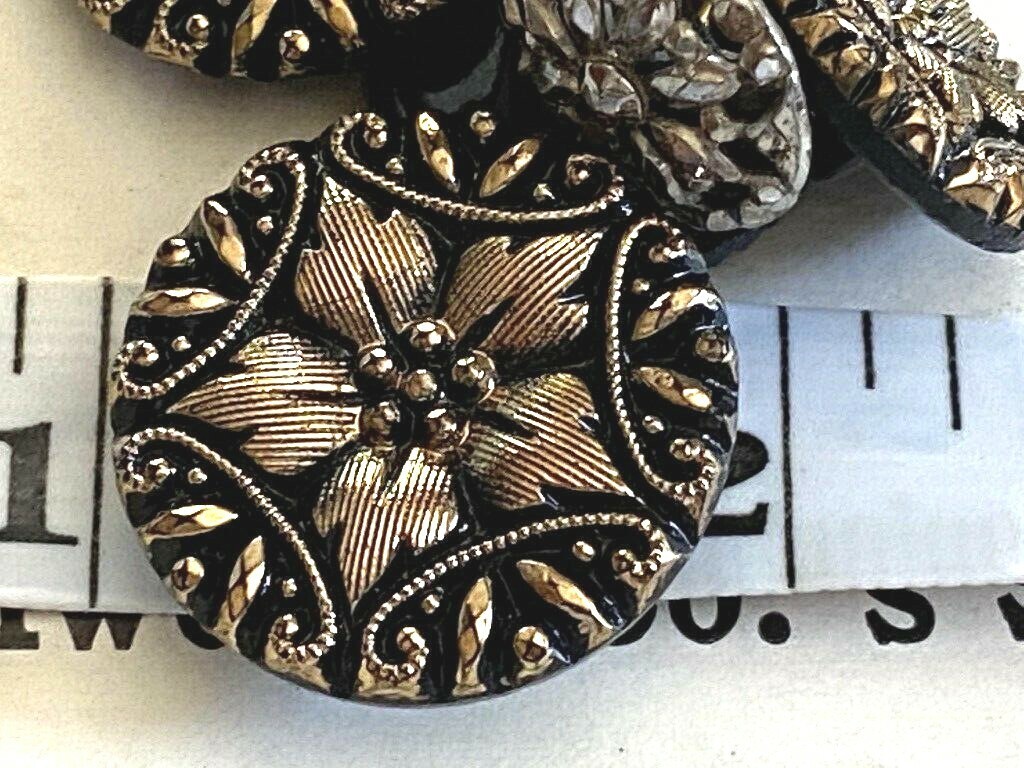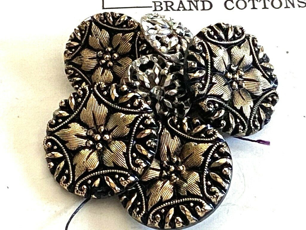 VTG Cut Glass Bronze Flower Metallic Buttons Shank 1950s (5) .5 & 7/8" Round