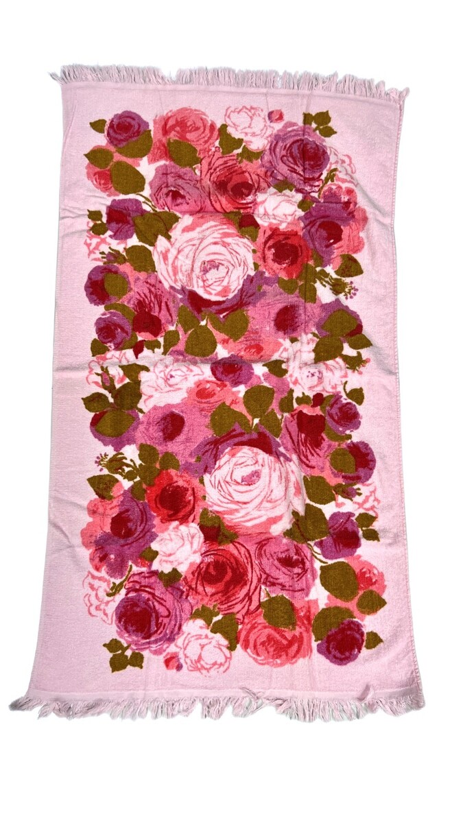 2 Vintage RETRO Hot Pink Bath Towels Flower Power Fringe MCM Retro Bright Roses