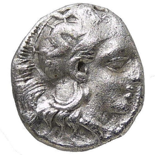 Obverse: Helmeted head of Athena right, with helmet with Skylla hurling a rock.