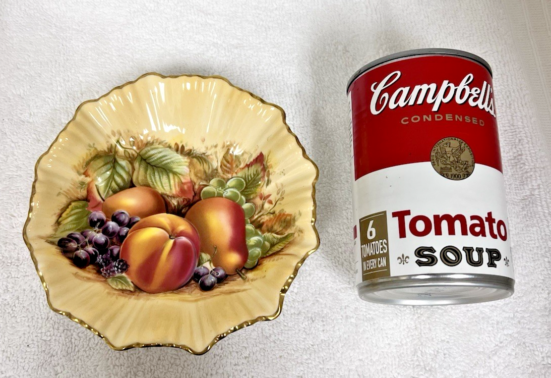 Vintage Aynsley Bone China Orchard Gold Fruit Pattern Fluted Candy Dish Shallow Bowl. Grapes Peaches Cherries Inside Pattern on pale yellow gold background, gold gild edge accent. Fluted candy bowl dish measures approx. 3/4" tall and 5 3/8" wide and is in very good condition, no damage, no visible wear to gold gilt accents. See pictures.