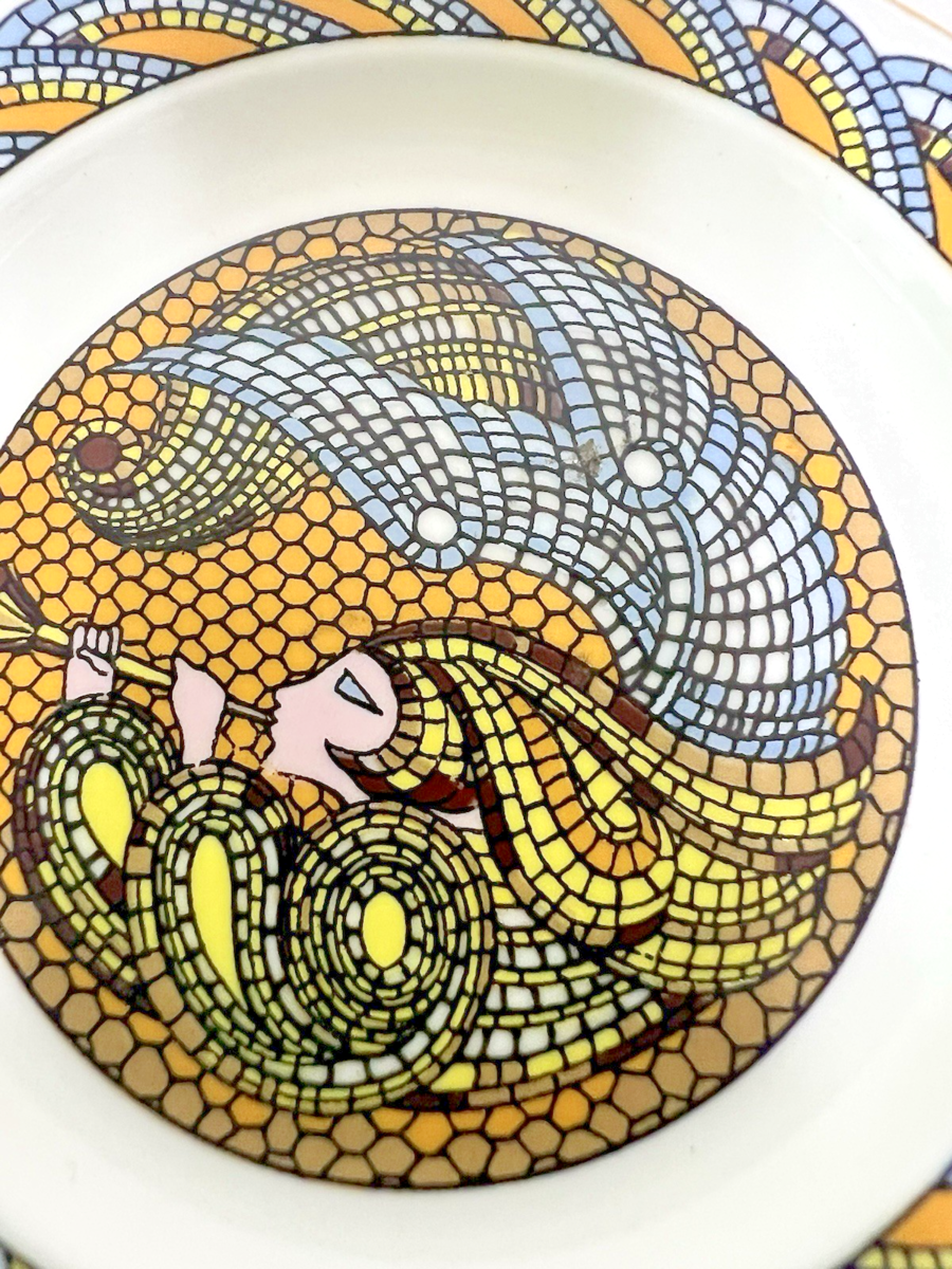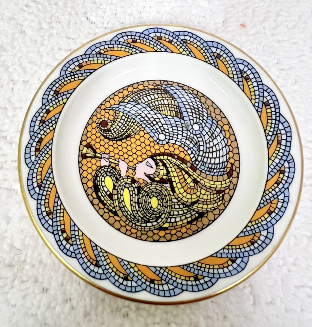 Vintage 1980 Maureen Jensen Miniature Mosaic Angel Design Christmas Plate 3". Cute mosaic horn blowing angel type figure miniature plate measures approx. 3" wide, no damage, colors great condition including gold accent rim trim, bottom marked. See pictures.