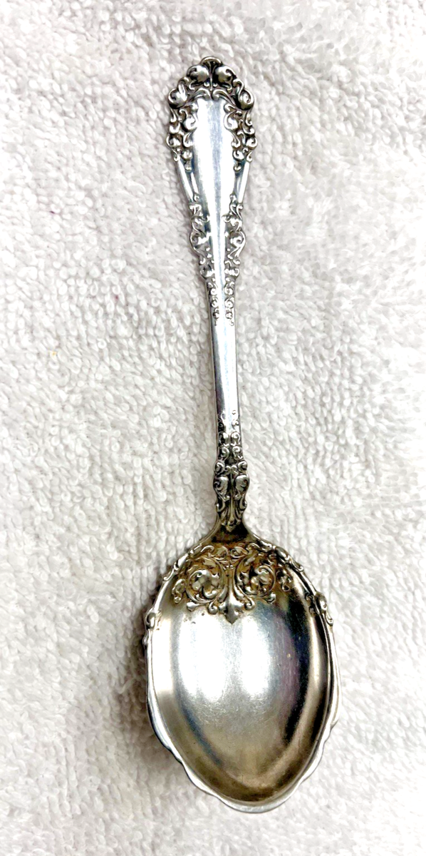 Silverplate Rogers Berkshire c1897 Ornate Scrolling Pattern Fluted Edge Sugar Spoon No Monogram measures approx. 6" long. Very good used condition some signs of use, might need cleaning. See pictures.