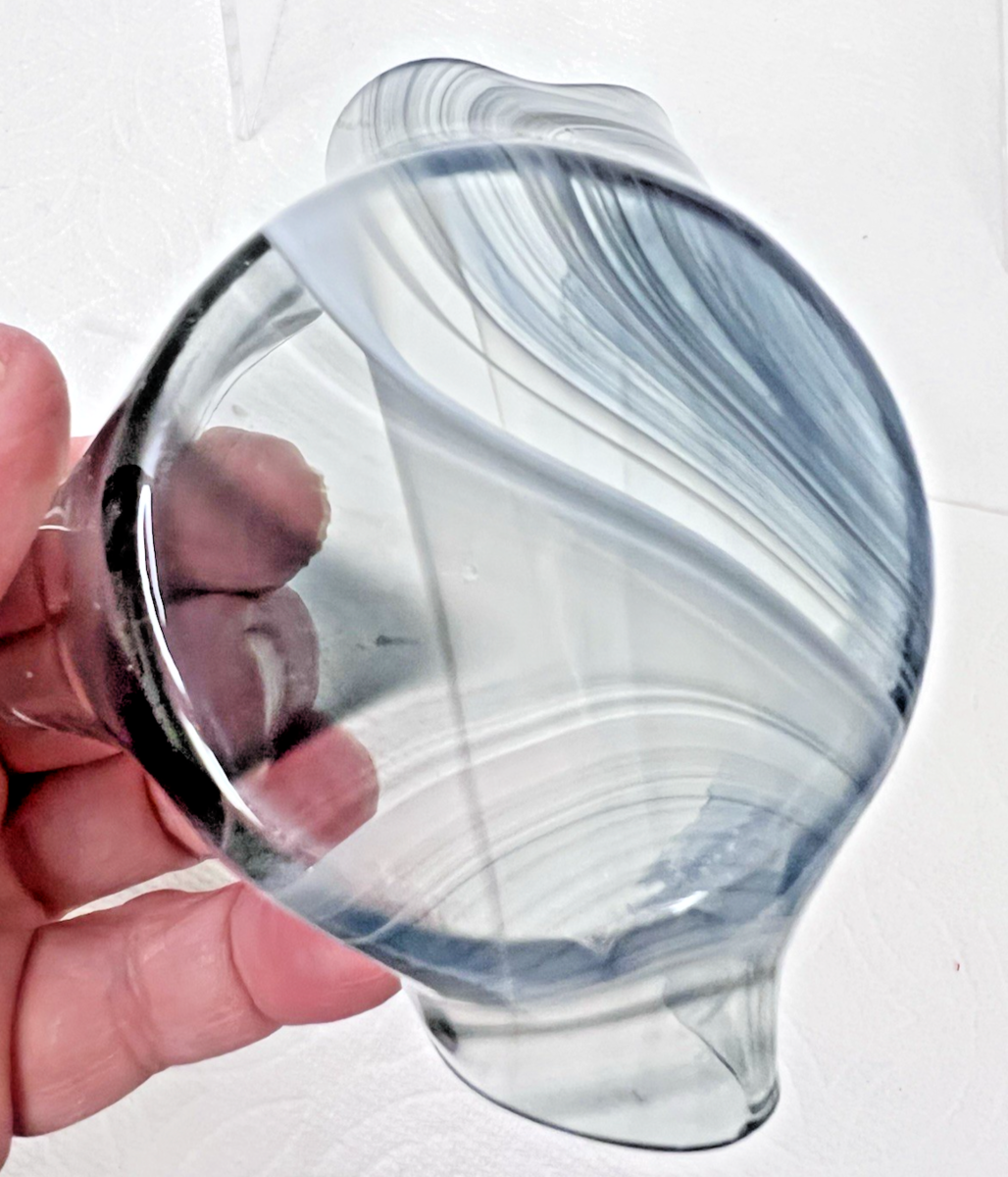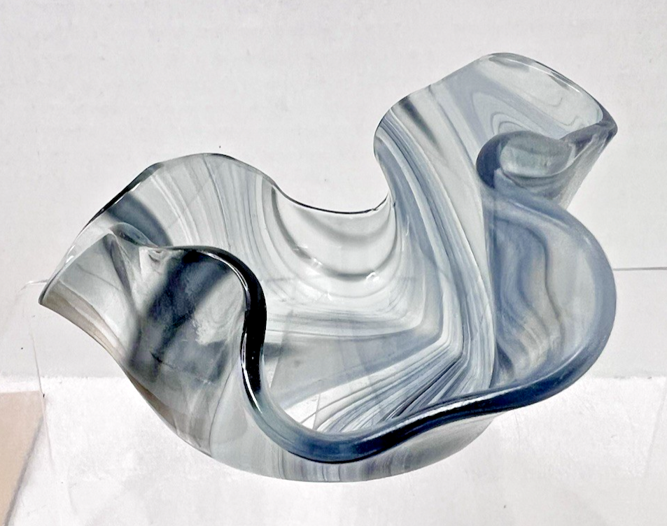 Handmade Mouth Blowen Glass Handkerchief Point Glass Mini Bowl Black Blue Grey in good shape no chips or cracks the highest point is 2 1/8 across 4 (widest part) base is 2.5 inches there is no pointel mark the rim has tiny waves they are not chips just small dips/waves we think it is from the tools used when pulling the points The colors are black to grey to almost a dark blue with clear. Just amazing and fun