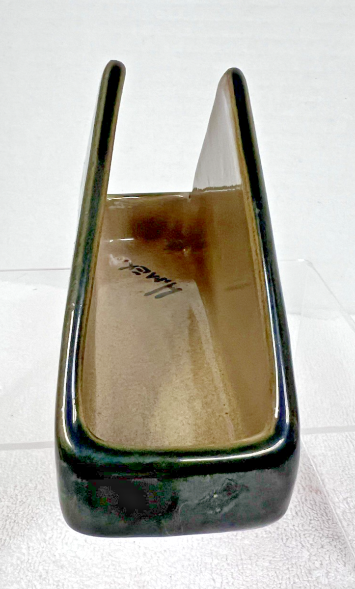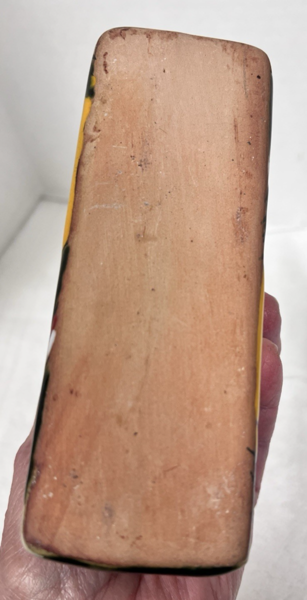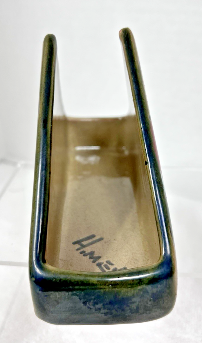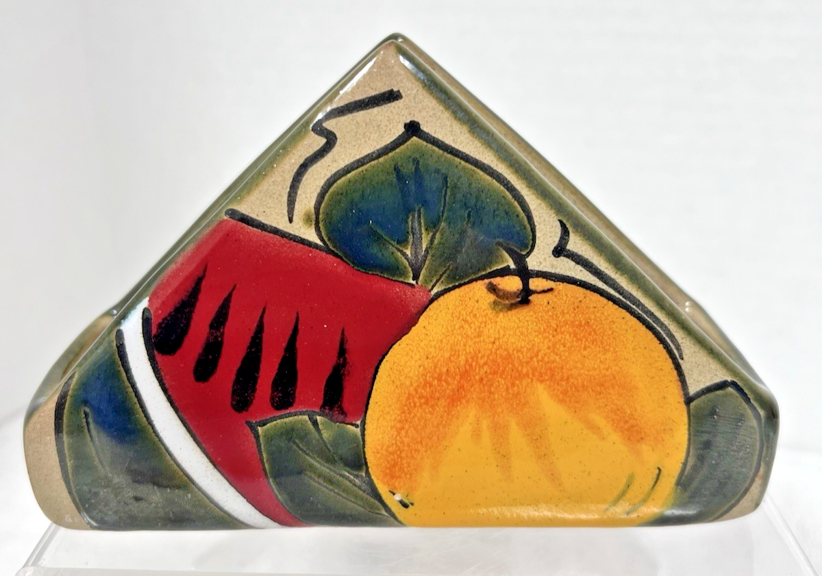 Hand Painted Fruits Watermelon Orange Color Fruit Triangle Shape Napkin Holder Mexican Clay Pottery Folk Art. Ceramic pottery triangle point middle table napkin holder measures approx. 5 3/4" long, 3 3/4" tall, and 2" wide. Greens, red earthtones nakpin holder is in very good condition, no damage, clear bright colors. See pictures.