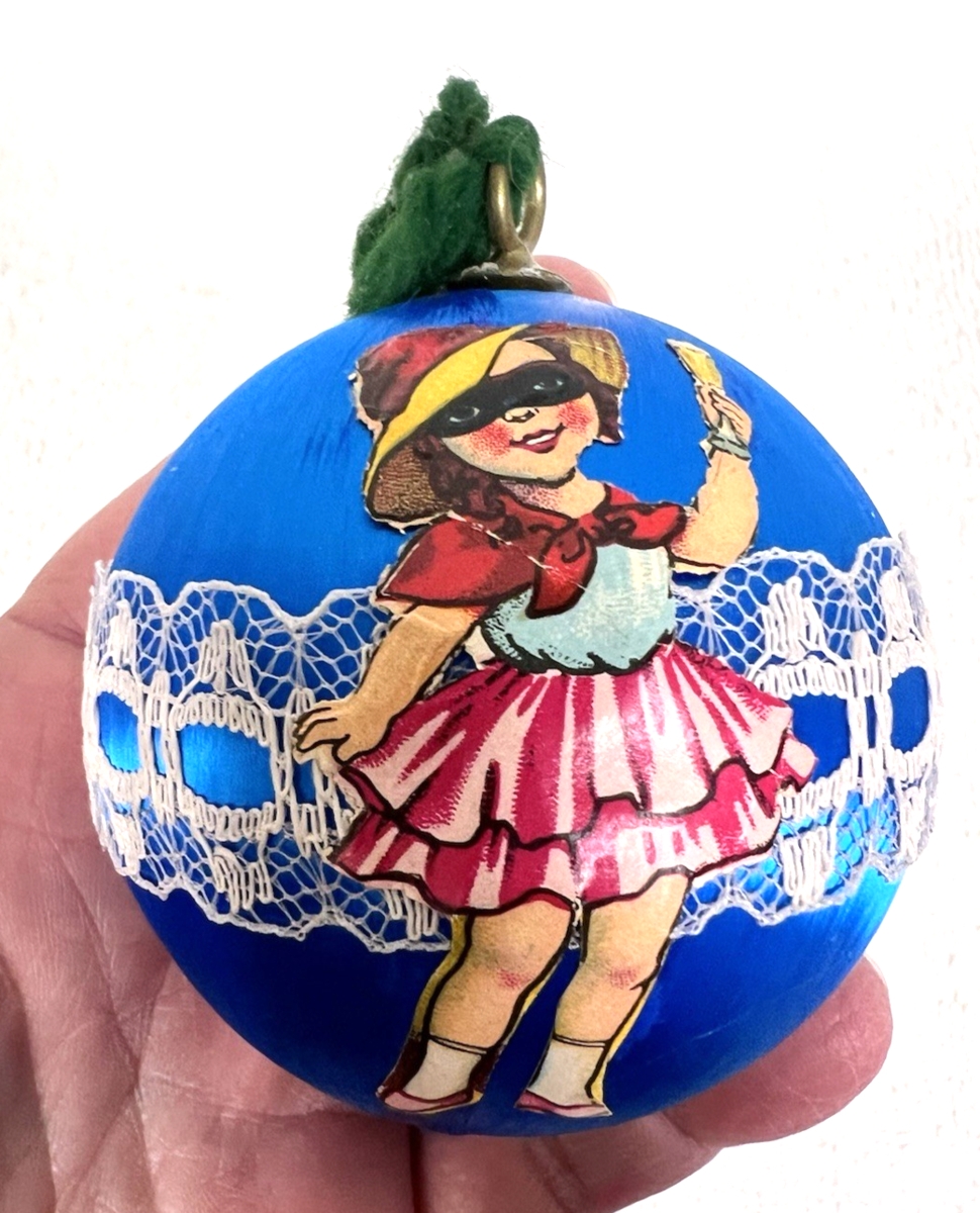 Vintage 1980's Handmade Blue Satin Lace Vintage Paper Masquerade Halloween Costume Children Satin Ball Ornament measures approx. 2" wide. Very nice condition, no snags, tears, clear bright colors, lace intact. No indication of maker same era as others could be handmade or factory hard to say. See pictures.