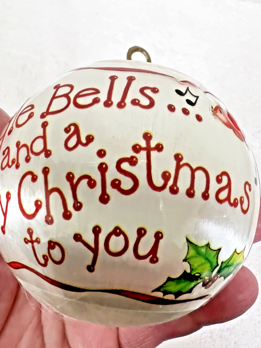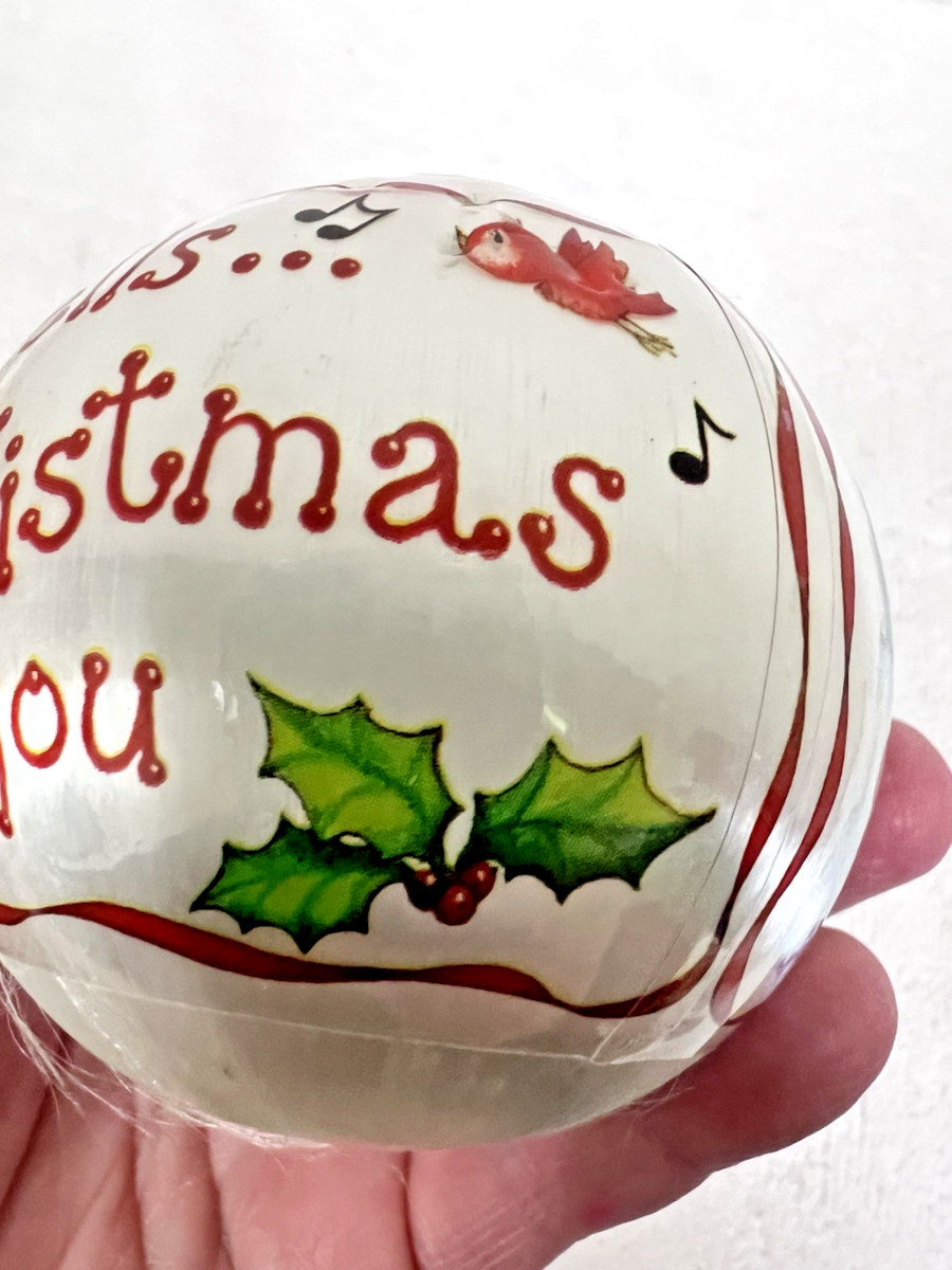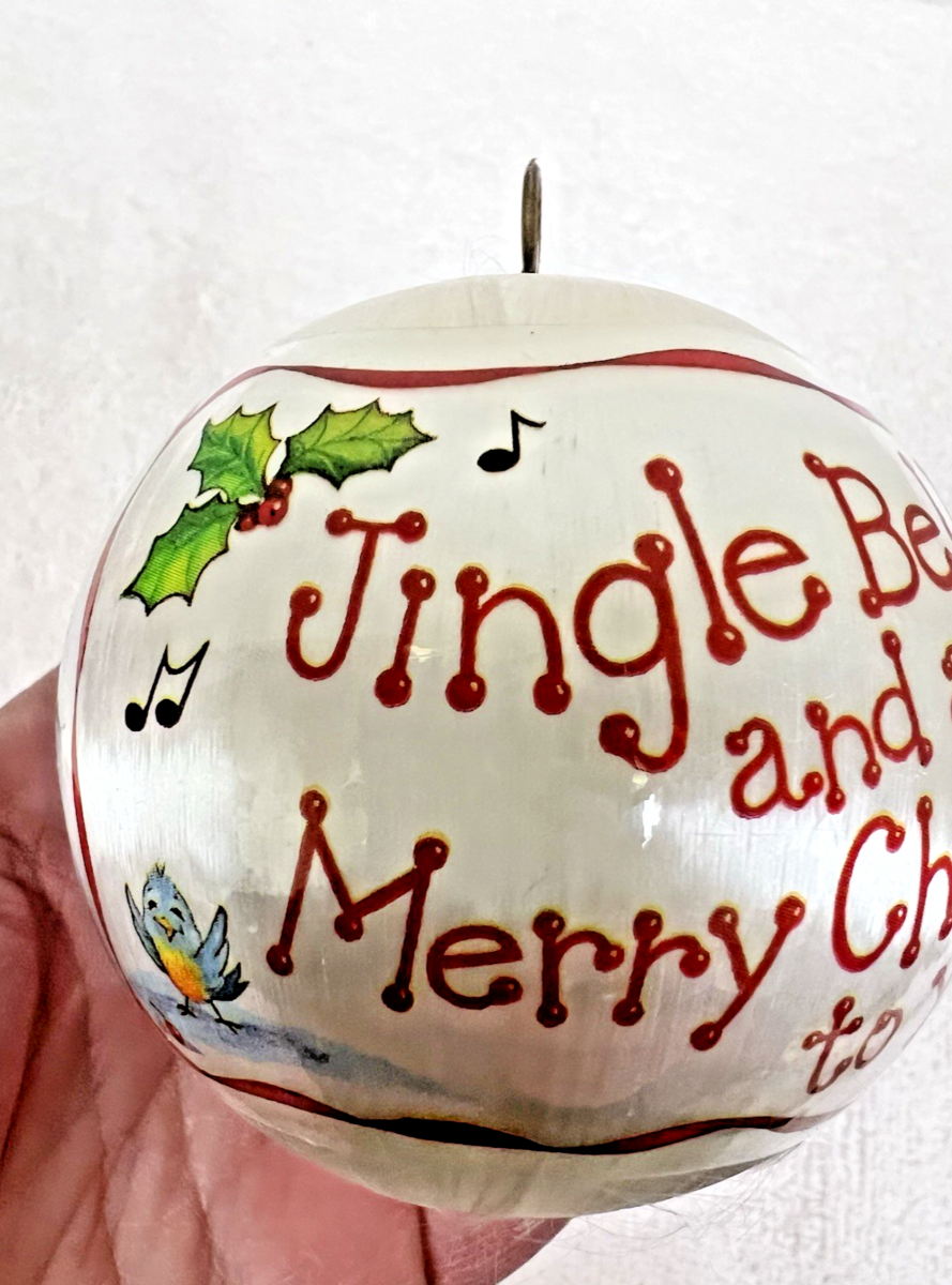 Vintage 1980's Jingle Bells and a Merry Christmas to You Boy Dog Squirrel Birds Snow Satin Ball Ornament measures approx. 2 1/2". Very nice condition, no snags, tears, clear bright colors, one small, dented area by a red bird singing. No indication of maker same era as others. See pictures.