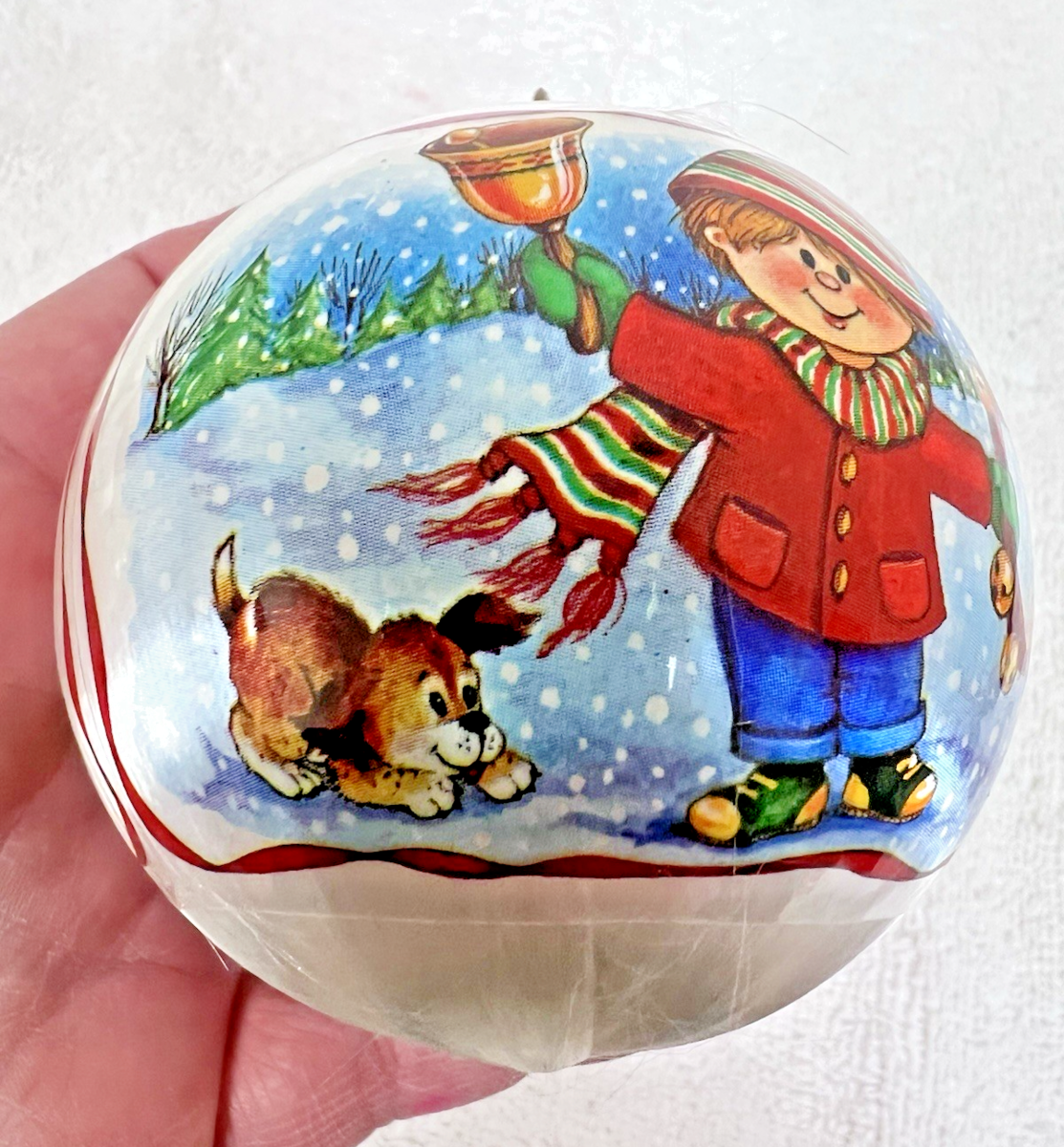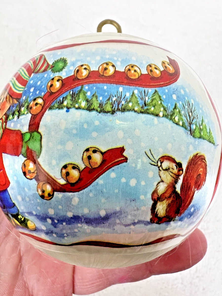 Vintage 1980's Jingle Bells Boy Dog Squirrel Snow Satin Ball Ornament 2 1/2"