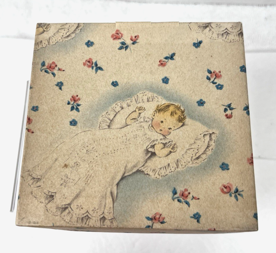 Antique Paper Gift Box w Baby on Pillow w Pink Flowers Design 4 3/4 x 2 7/8 inch