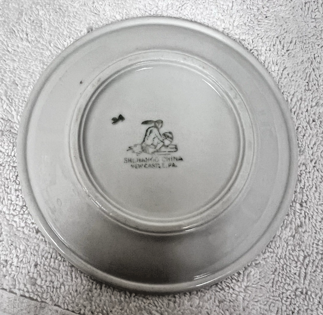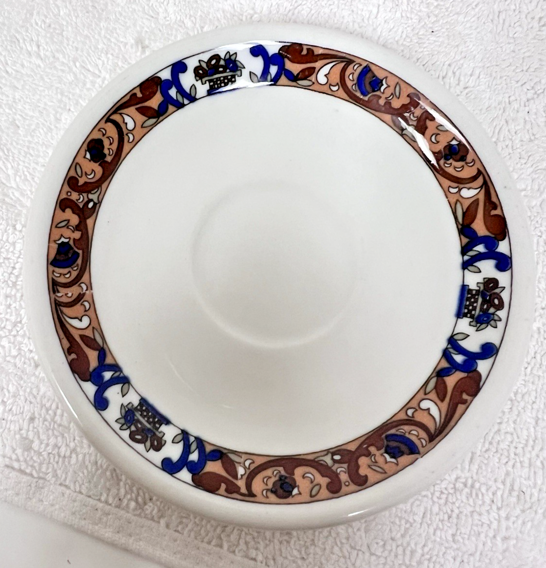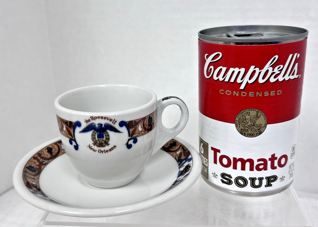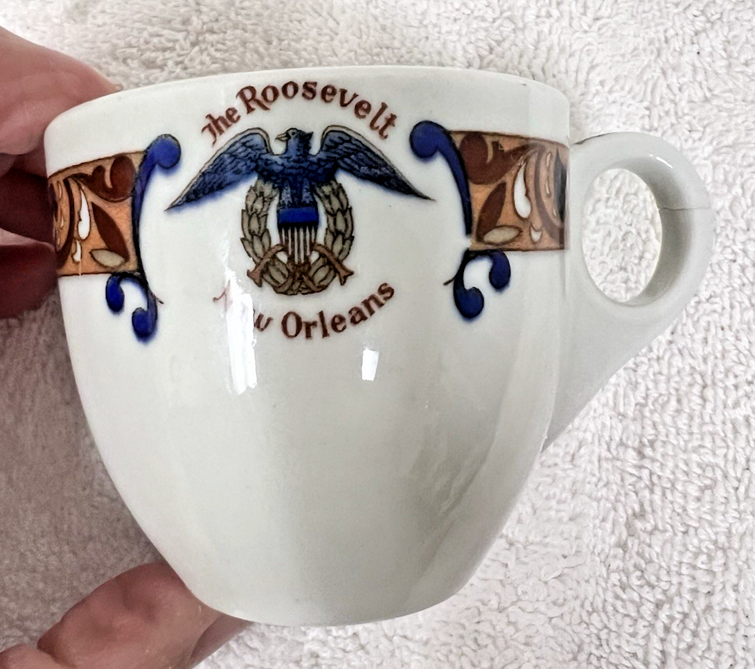 Vintage Roosevelt Hotel New Orleans Blue Eagle Wreath Brown Blue Border Pattern Demitasse Cup Saucer Shenango China. Handle has a hairline but its solid and can still be used Hotel demitasse cup measures approx. 2 1/4" tall and the saucer measures approx. 4 7/8" wide. No damage, clear bright colors, lettering great condition. See pictures.