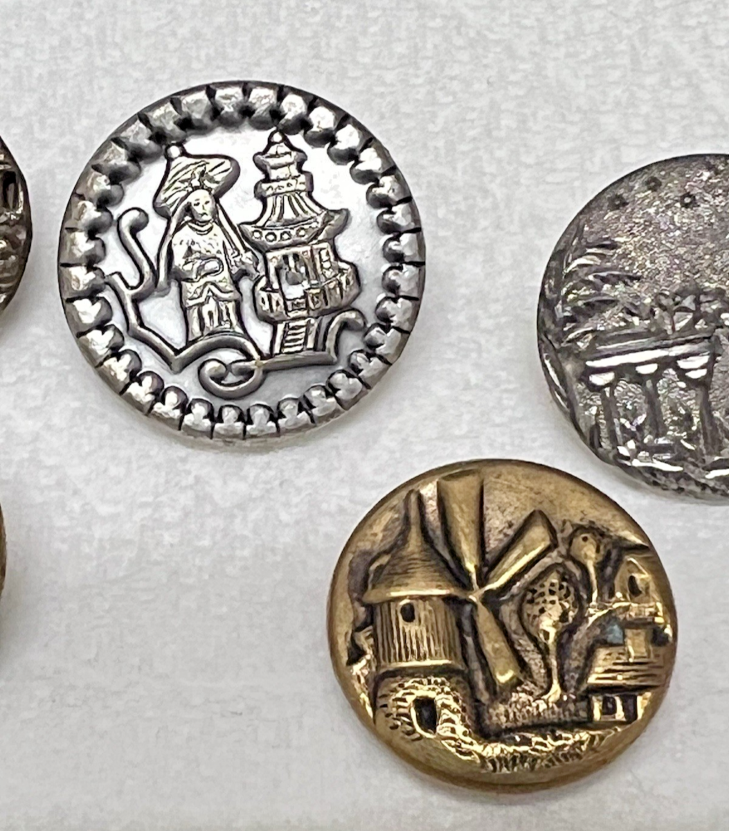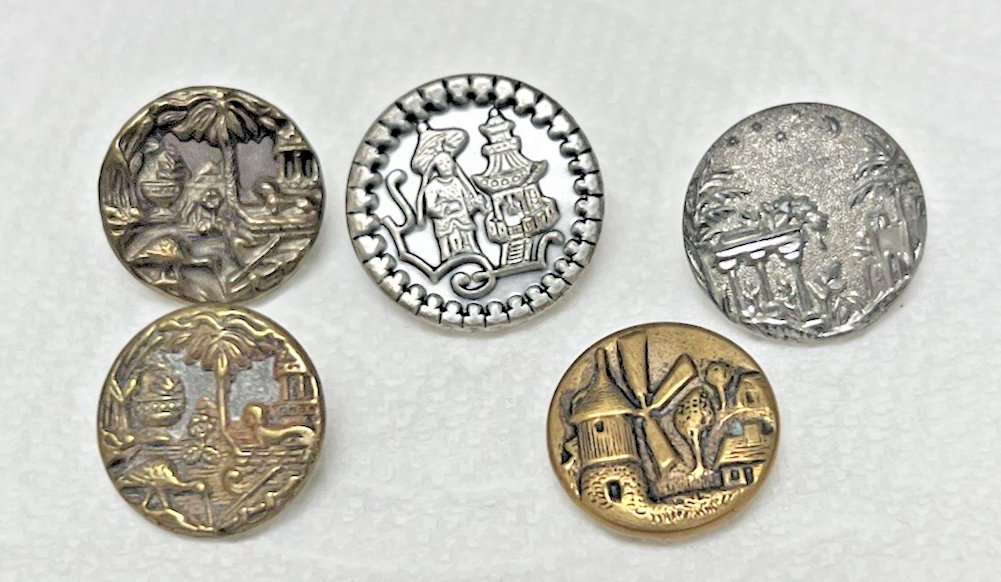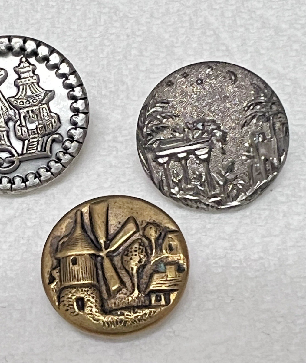 5 Vintage Metal Buttons w Buildings Birds Windmills and More 1/2-5/8 inch