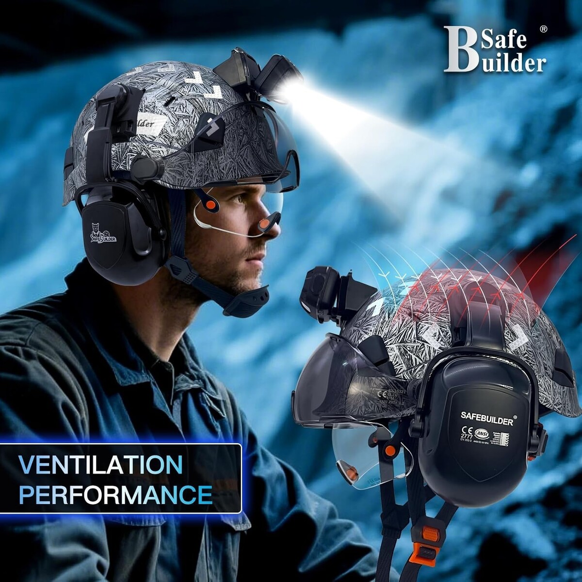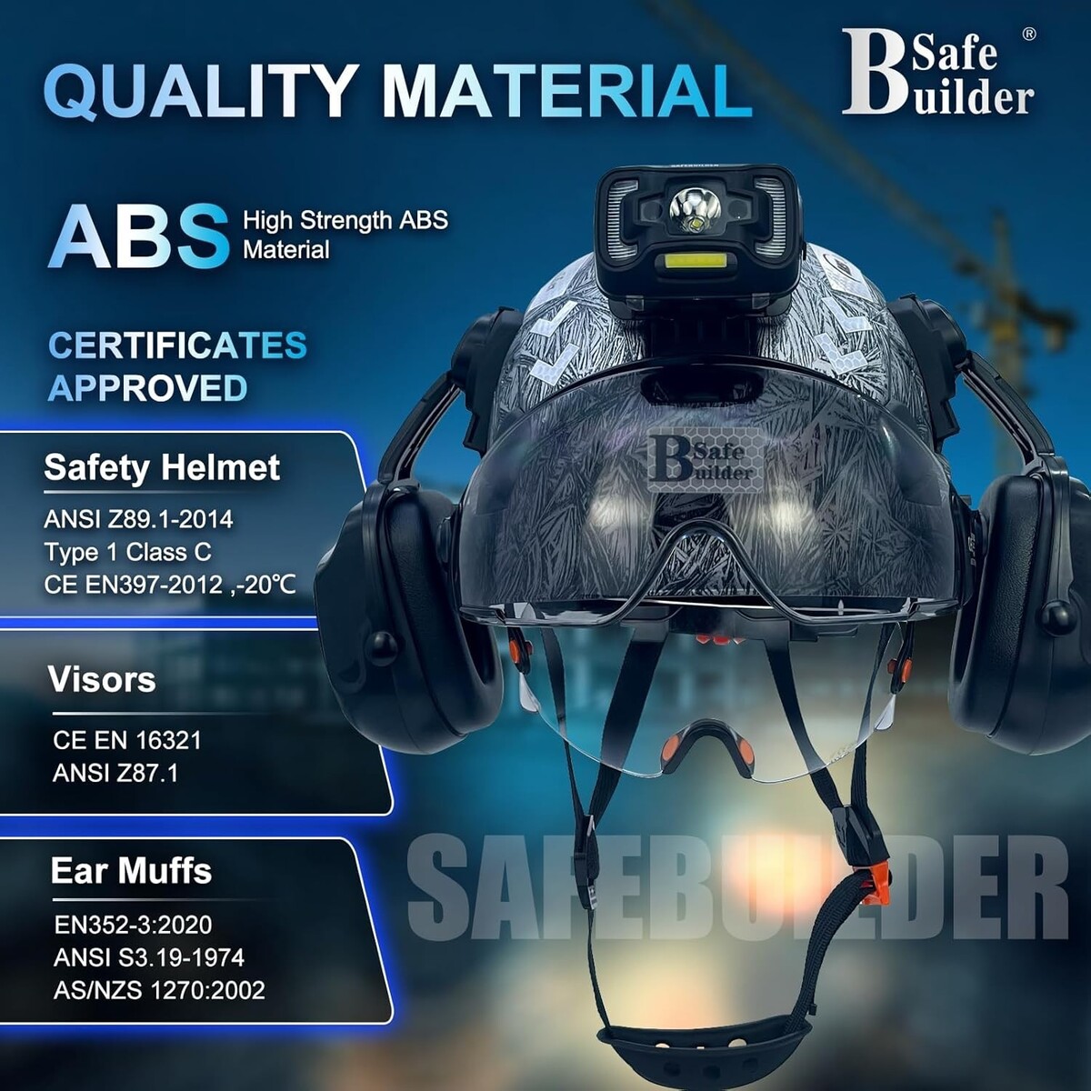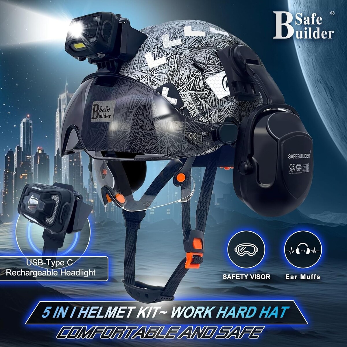 ? Accessories Included: This hard hat comes with mountable ear muffs for hearing protection, an integrated headlamp, and safety visors (both clear and tinted options available) to ensure visibility during day and night work.