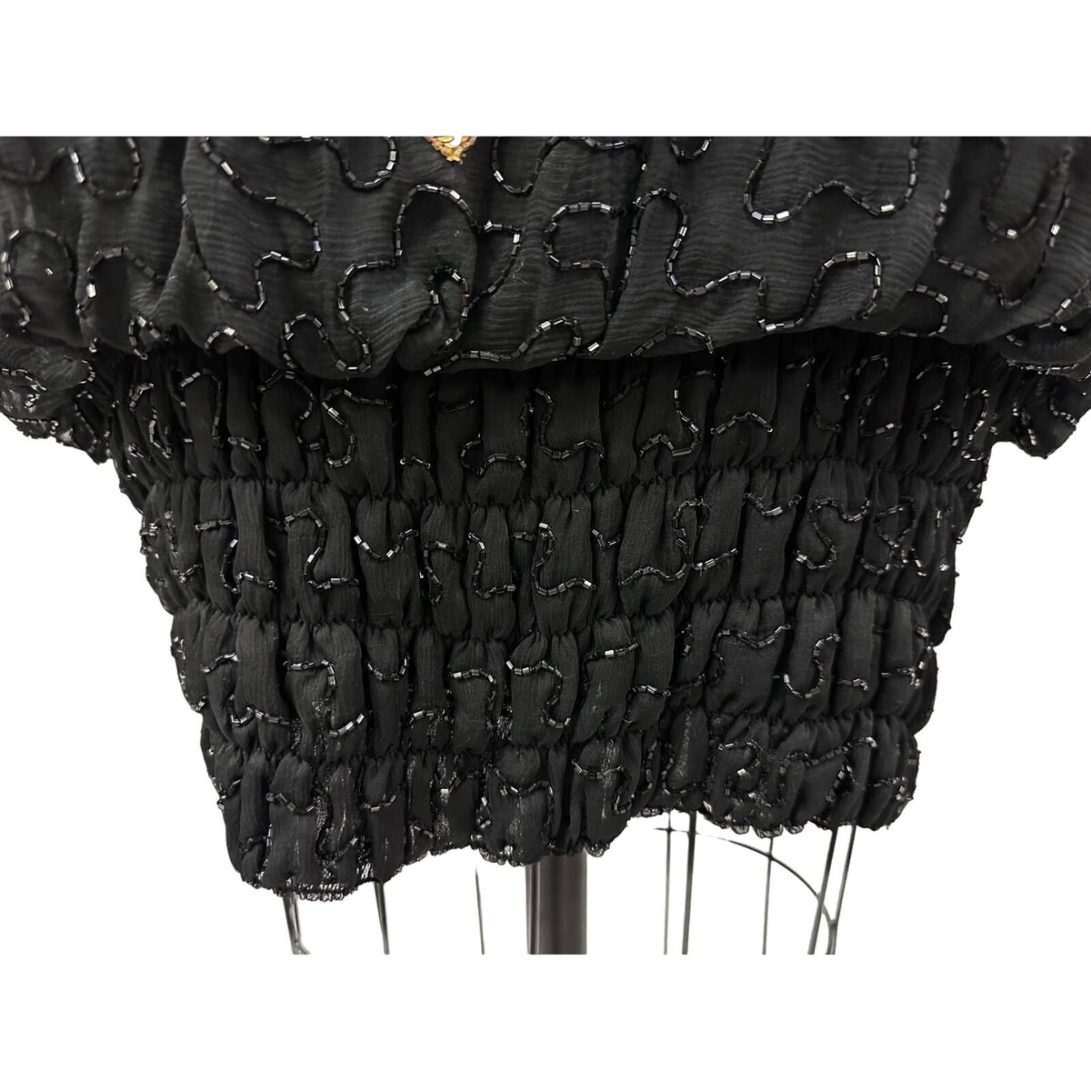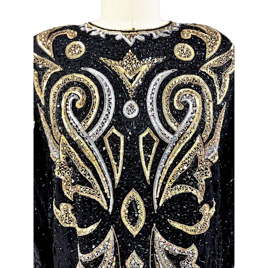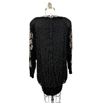 Vintage 80s Designer Lillie Rubin Sequined Silk Dress Black Hobble Hem L