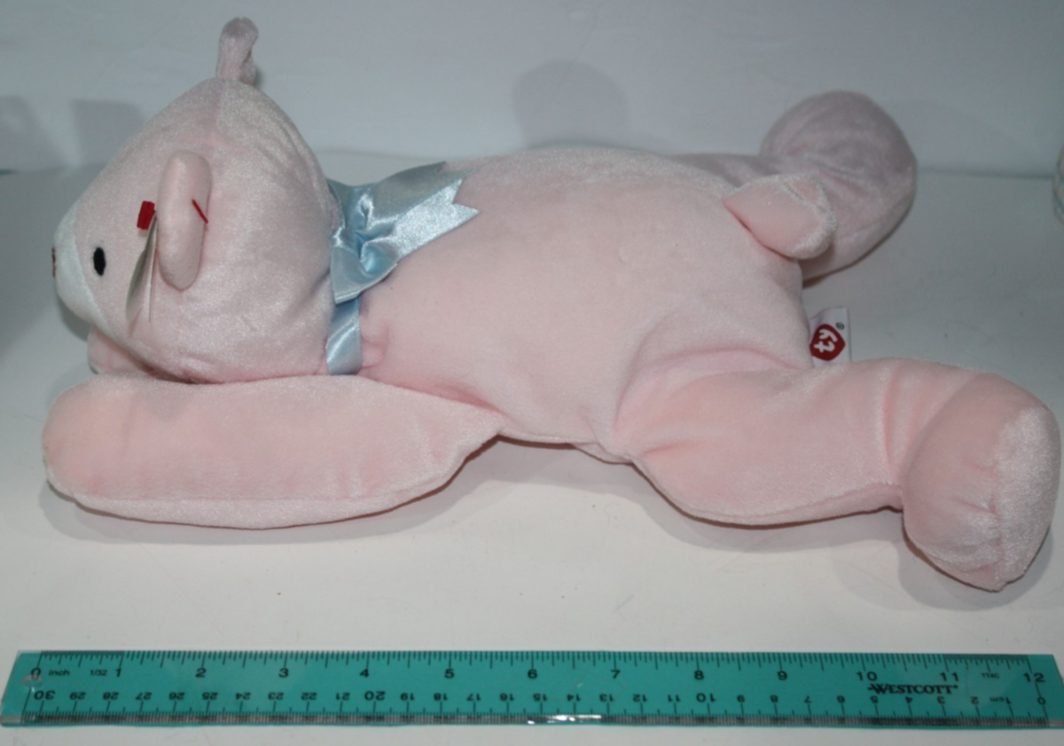 Ty, Pillow Pals, SNUGGY the Pink Baby Bear, Approx 14 Inch, Baby Stuffed Animal, wears a Blue Satin Neck Bow, Soft Toy with Paper Hang Tag, Seam Tag, MWMT
