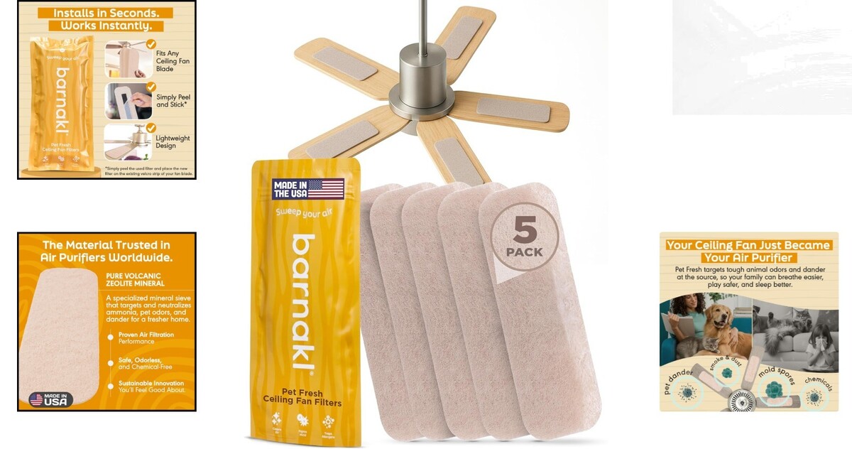 Enhance the air quality in your pet-friendly home with our groundbreaking scientifically tested ceiling fan filters. These filters are designed with natural zeolite to effectively trap pet odors, dander, and airborne dust as your ceiling fan circulates air, ensuring a fresher atmosphere without the use of added scents or chemicals.