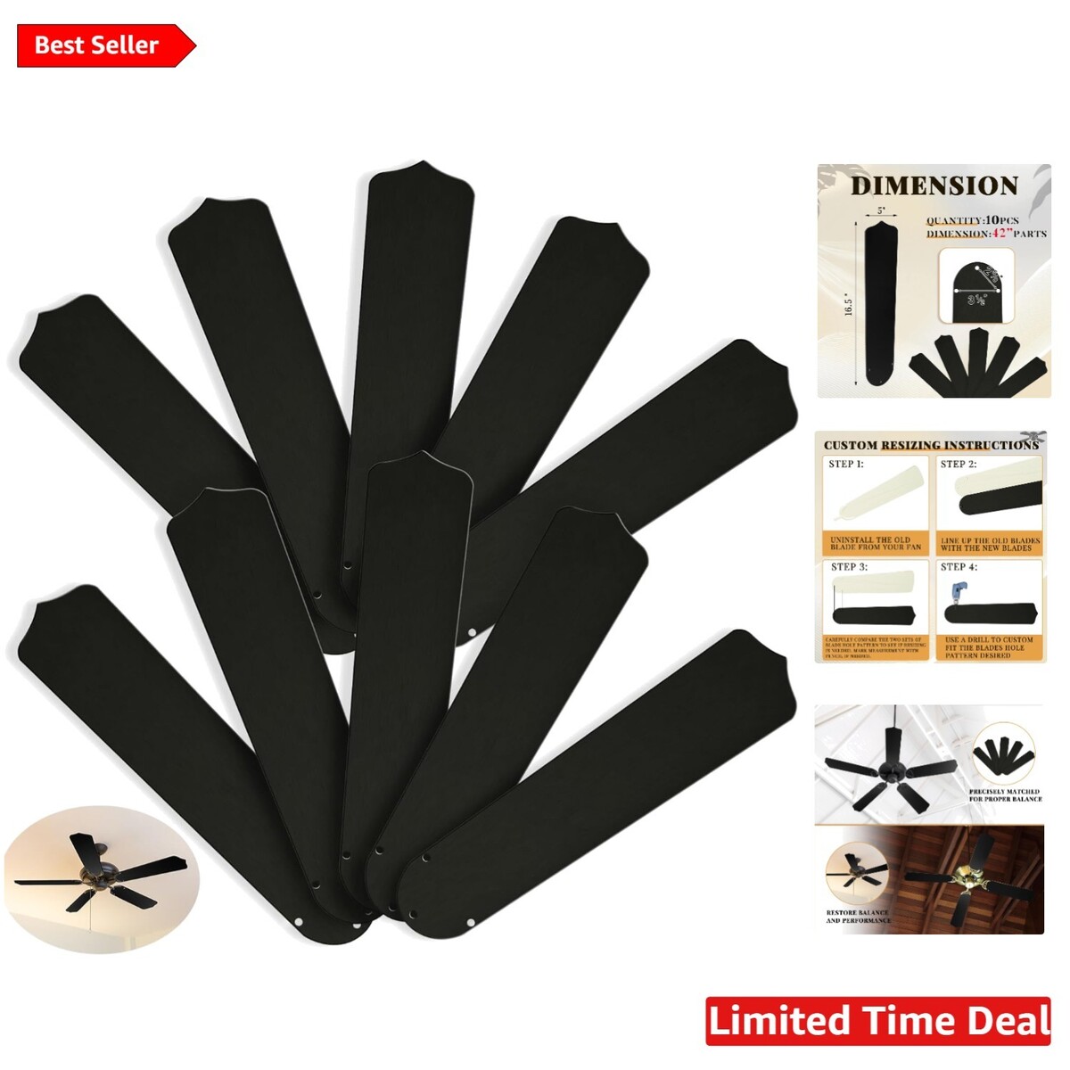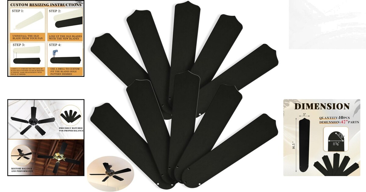 Elevate your ceiling fan experience with our package, featuring 10 replacement blades specifically designed for 42-inch ceiling fans. This convenient solution ensures that you have ample replacements ready at your disposal, allowing you to periodically maintain your fan. Regular maintenance not only extends the lifespan but also enhances the performance of your fan. Please ensure you measure your fan size before placing an order to guarantee a perfect fit.