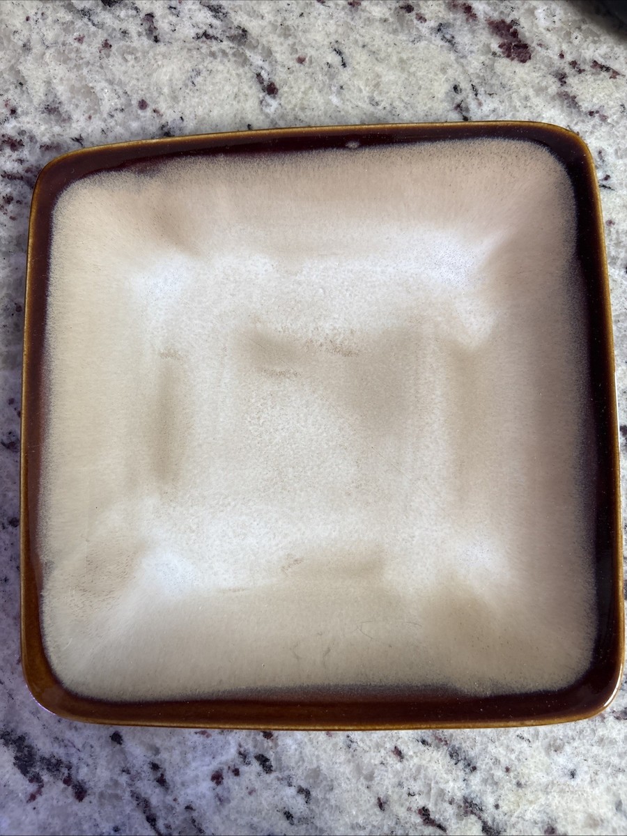 The SANGO NOVA BROWN SQUARE SALAD PLATE is a vintage stoneware dish featuring a unique Nova Brown pattern in a square shape. Made in America with a glossy finish, this salad plate is part of a set that includes a printed backstamp. It is dishwasher safe and represents the art pottery production style of the 2000s, showcasing a blend of American and Chinese craftsmanship. Perfect for all occasions, this Sango salad plate adds a touch of charm and elegance to any dining experience.