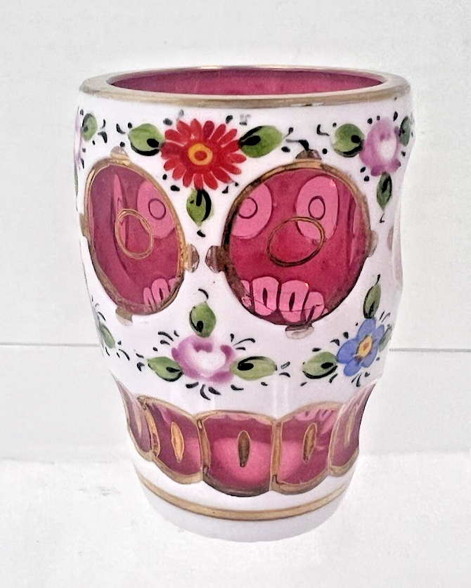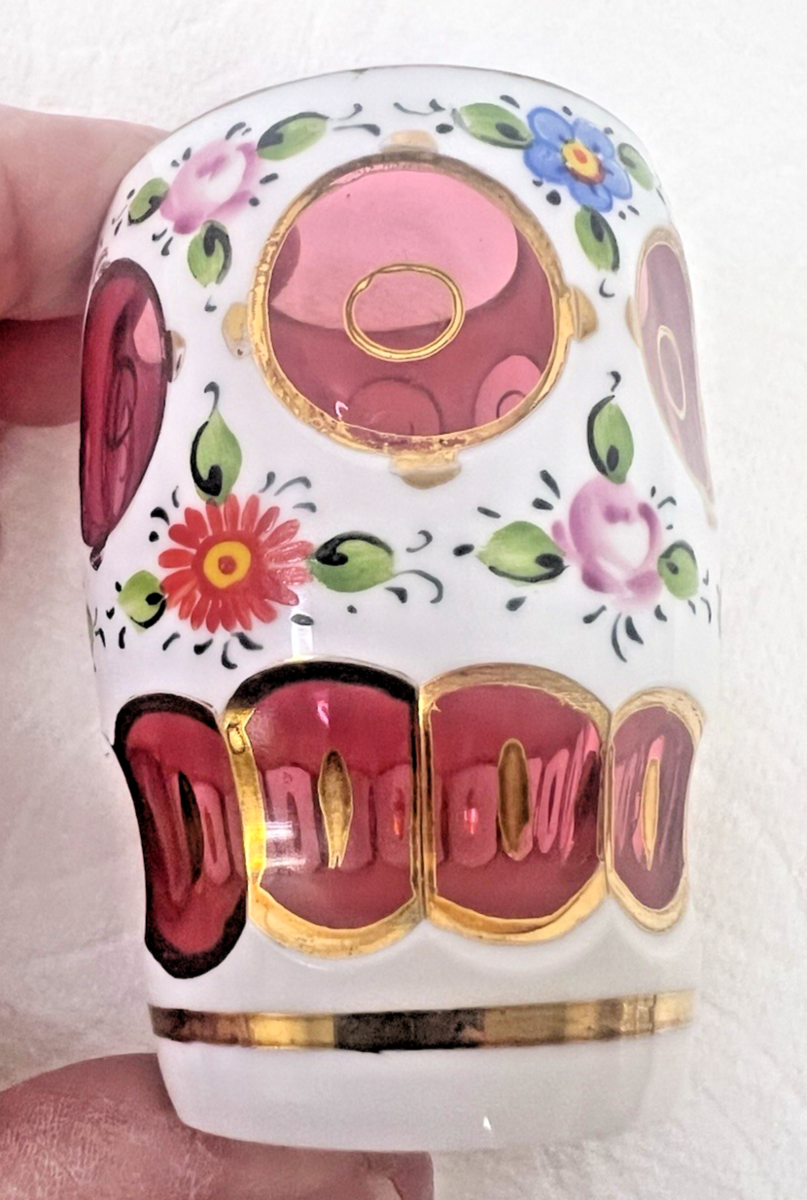 OLD BOHEMIAN CZECH Cased Glass WHT Overlay Cut to Pink Cranberry 2 3/8 Vessel