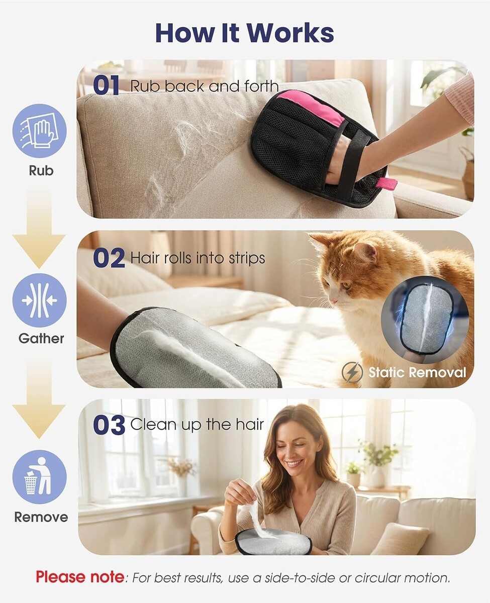 Easy to Clean: Glide the glove over any fabric in quick back-and-forth or circular motions, utilizing static electricity to effortlessly gather pet hair and lint.