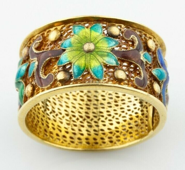 Wunderschoner handgefertigter Band-Mesh-Ring aus 14-karatigem Gelbgold mit wunderschonem Emaille-Detail, Große 6
