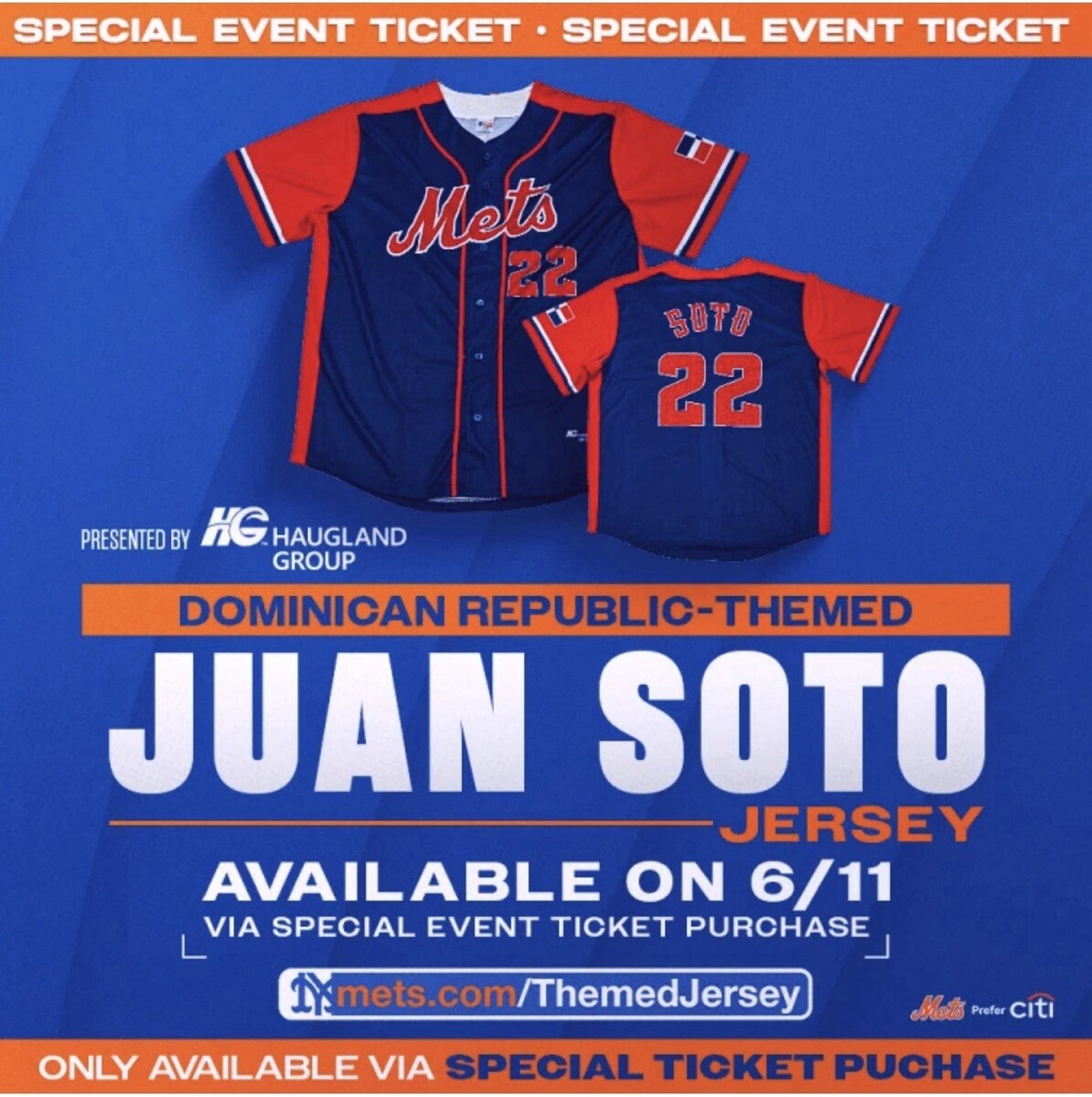 NY Mets, Juan Soto, Dominican Republic Jersey #22 SGA 6/11/2025 Size Medium