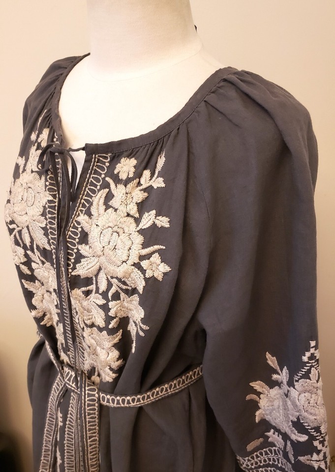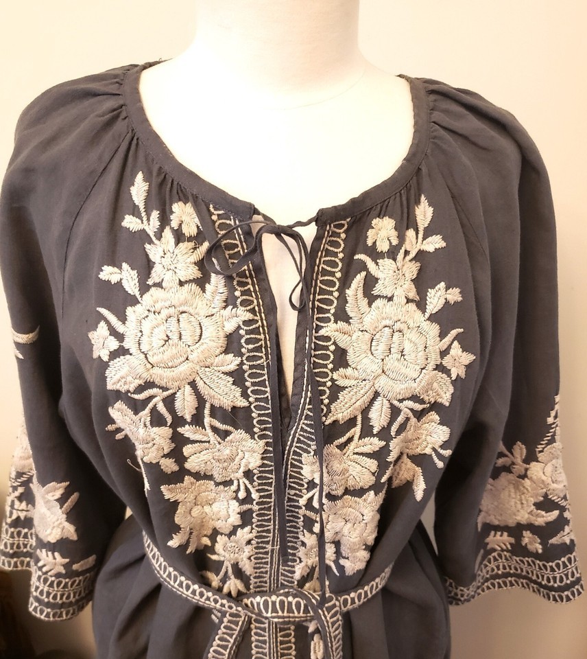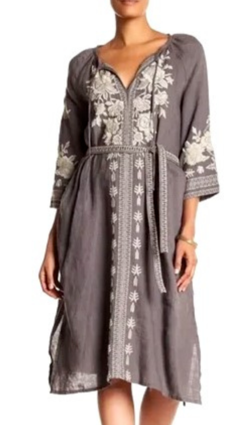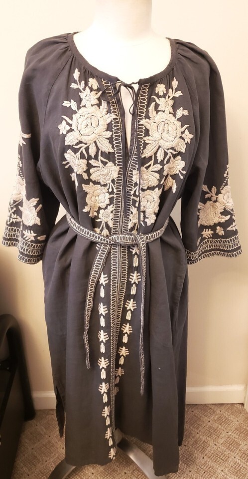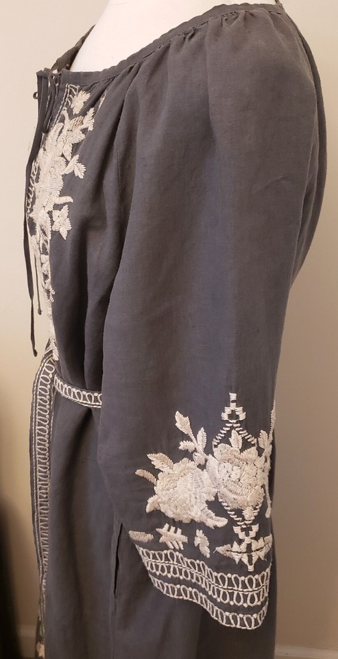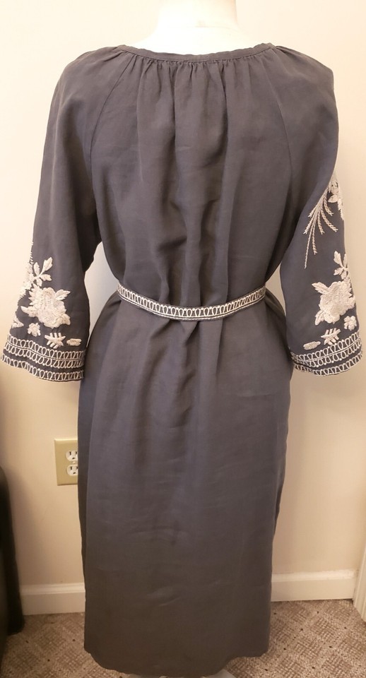 Johnny Was Embroidered Midi Dress Size-L Gray 100% Linen