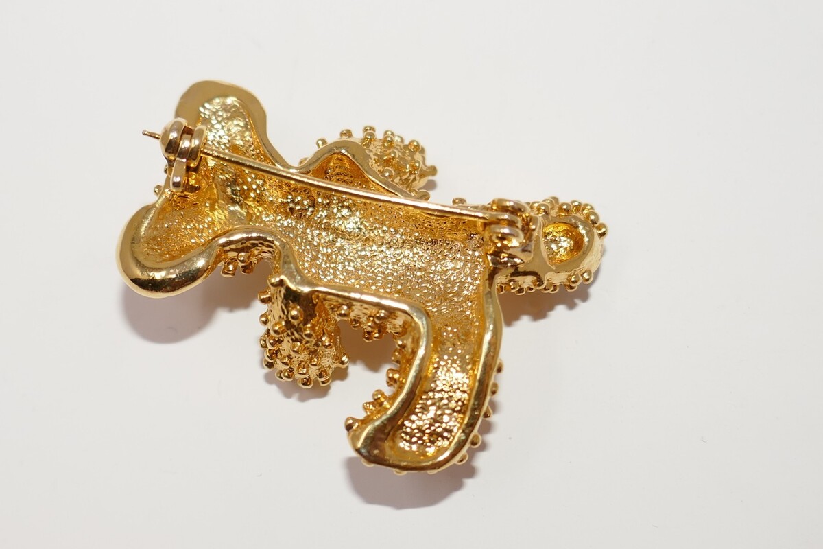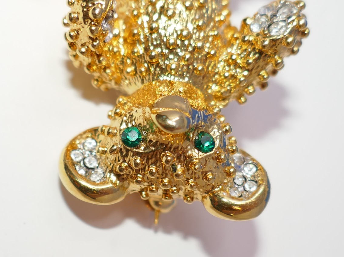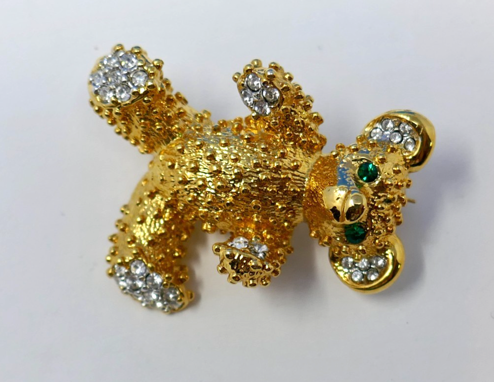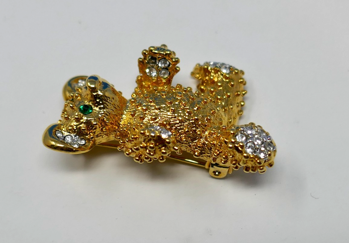 This gold tone vintage teddy bear brooch features green rhinestone crystal eyes and white for his paws and ears, adding a whimsical touch to any outfit. The mixed materials and pave setting style give it a unique and charming look, perfect for women who appreciate vintage jewelry. With a length of 1.25 inches, this original piece is sure to stand out with its adorable animal and insect theme, making it a lovely addition to any collection.