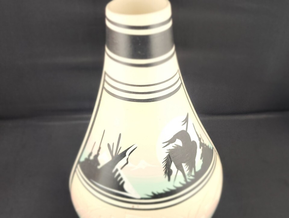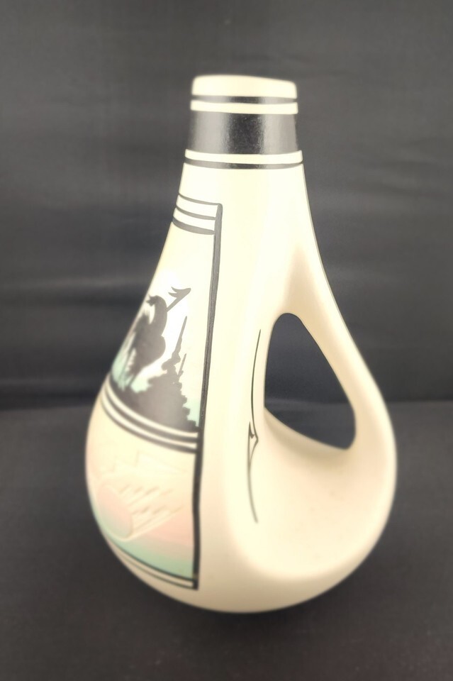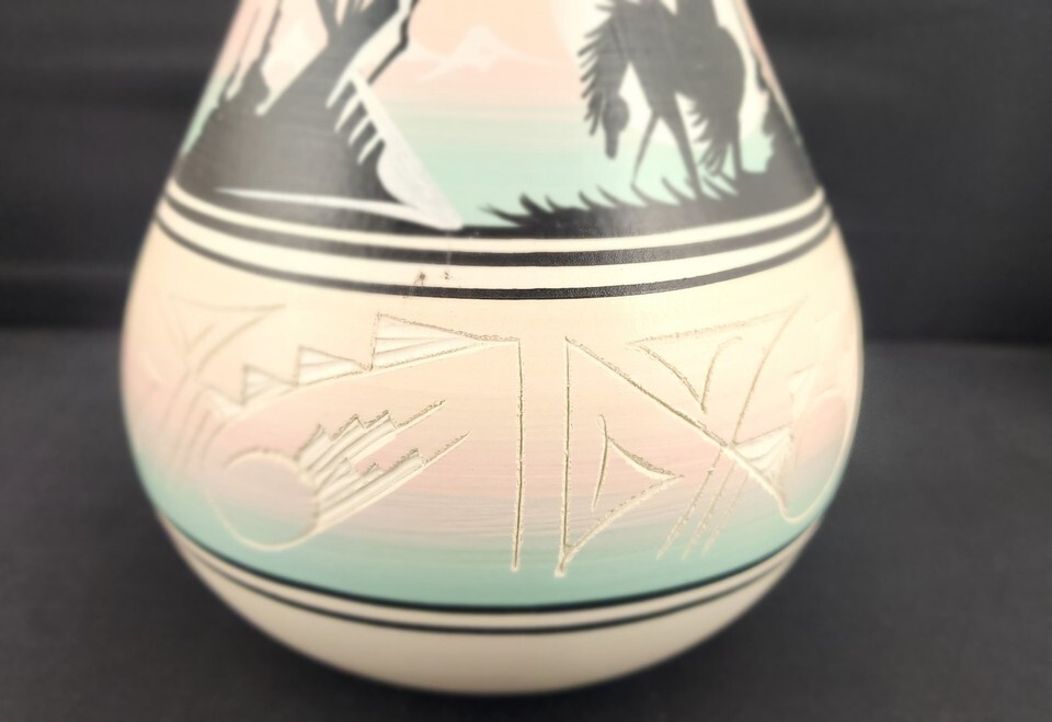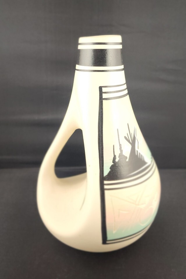 Experience the beauty of the Southwest with this authentic 9-inch Navajo Pottery Vase signed by the recognized artist N. Nesbitt. This handcrafted piece features the iconic 'End of the Trail' silhouette hand-painted in striking dark tones against a soft pastel desert background. Condition: Excellent vintage condition with no chips or cracks.