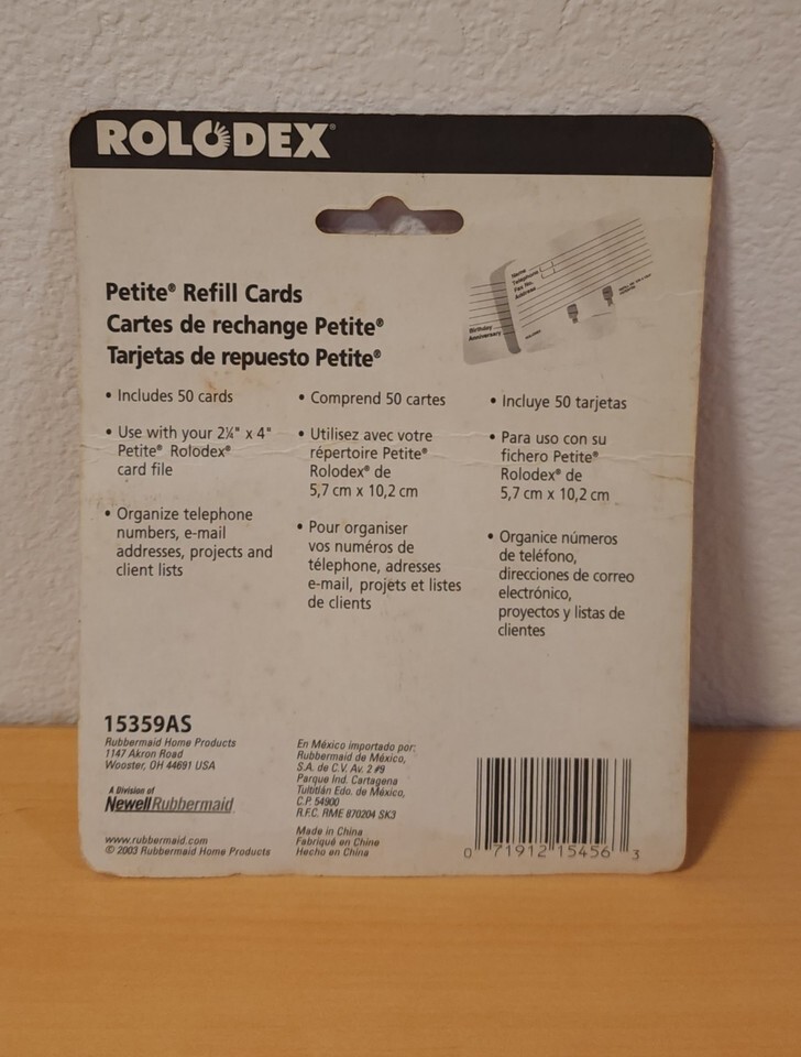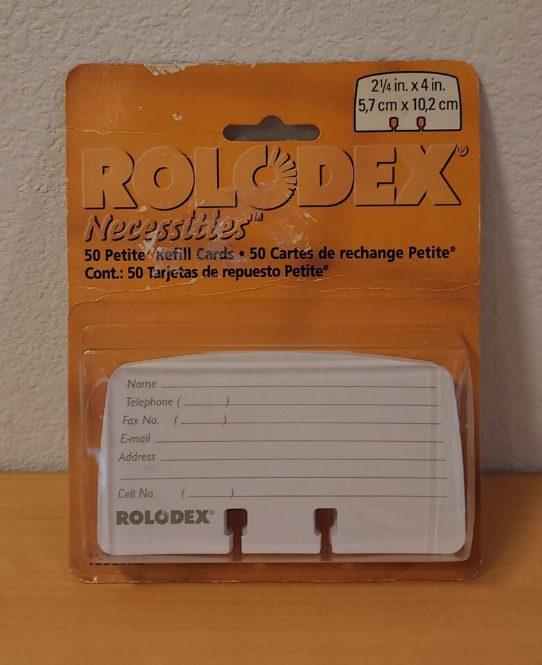 Keep your contact file up to date with this authentic Vintage Rolodex Petite Refill Cards set. This 50-card package is New-In-Package (NOS) and features a detailed ruled format with dedicated lines for name, address, and telephone information. Condition: Factory sealed in original orange 1990s-era packaging; the cards are pristine and ready to fit any standard Rolodex Petite rotary or tray file.