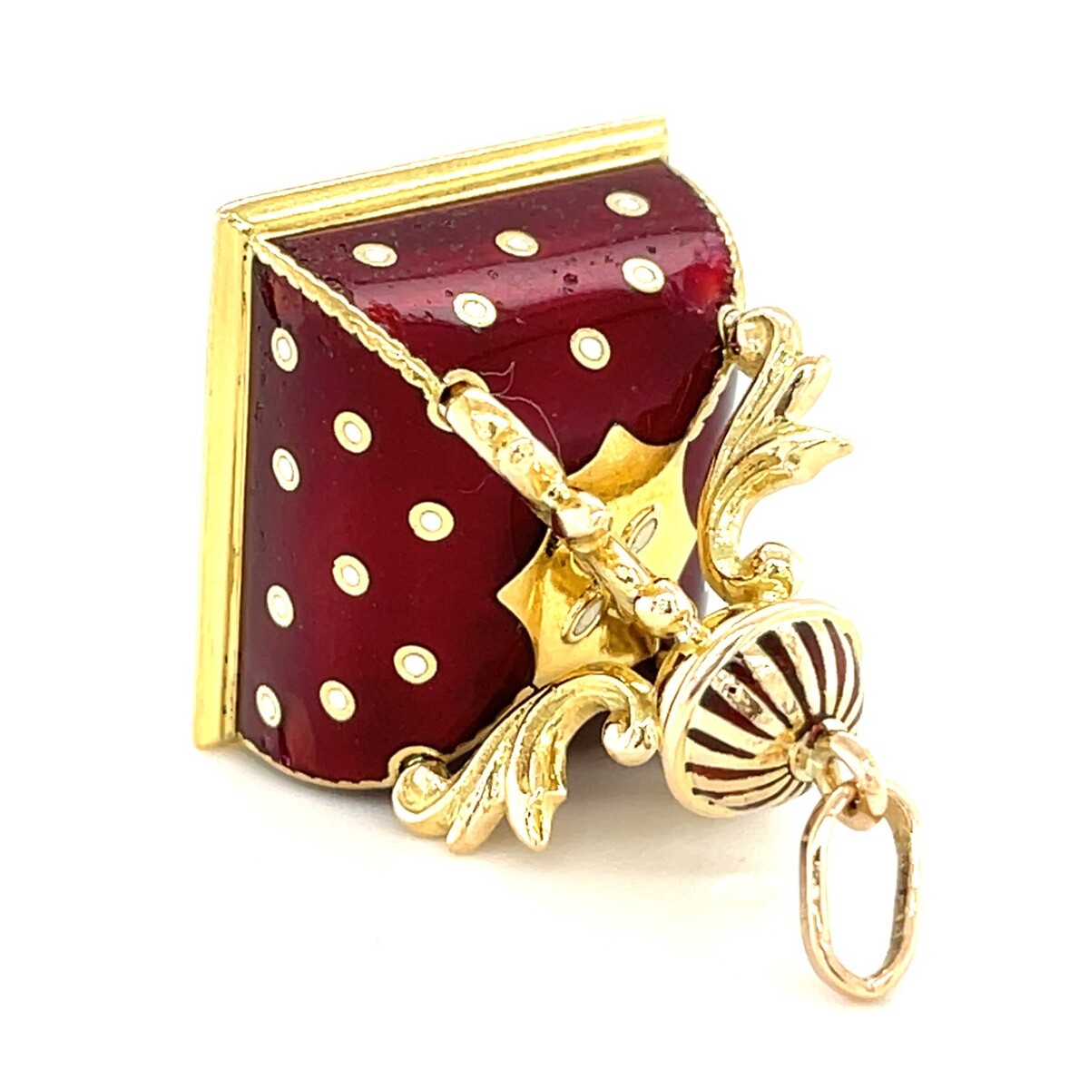 The top dome and sides are decorated with rich red enamel accented with white polka dots
