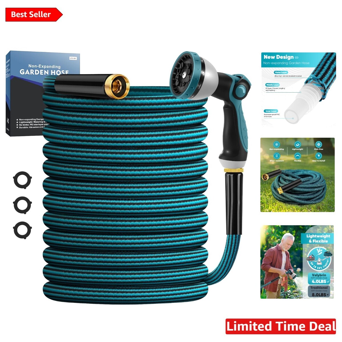 The unique three-layer design ensures flexibility and durability, eliminating the frustrating kinks and tangles of traditional hoses. Plus, its lightweight construction makes every watering task a breeze, letting you focus on the joy of gardening rather than the hassle of handling. Store it away compactly when you're done, and enjoy its versatility with the 8-function nozzle to tackle any chore.