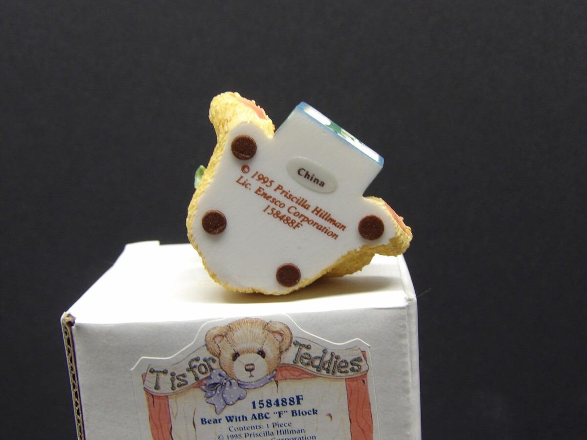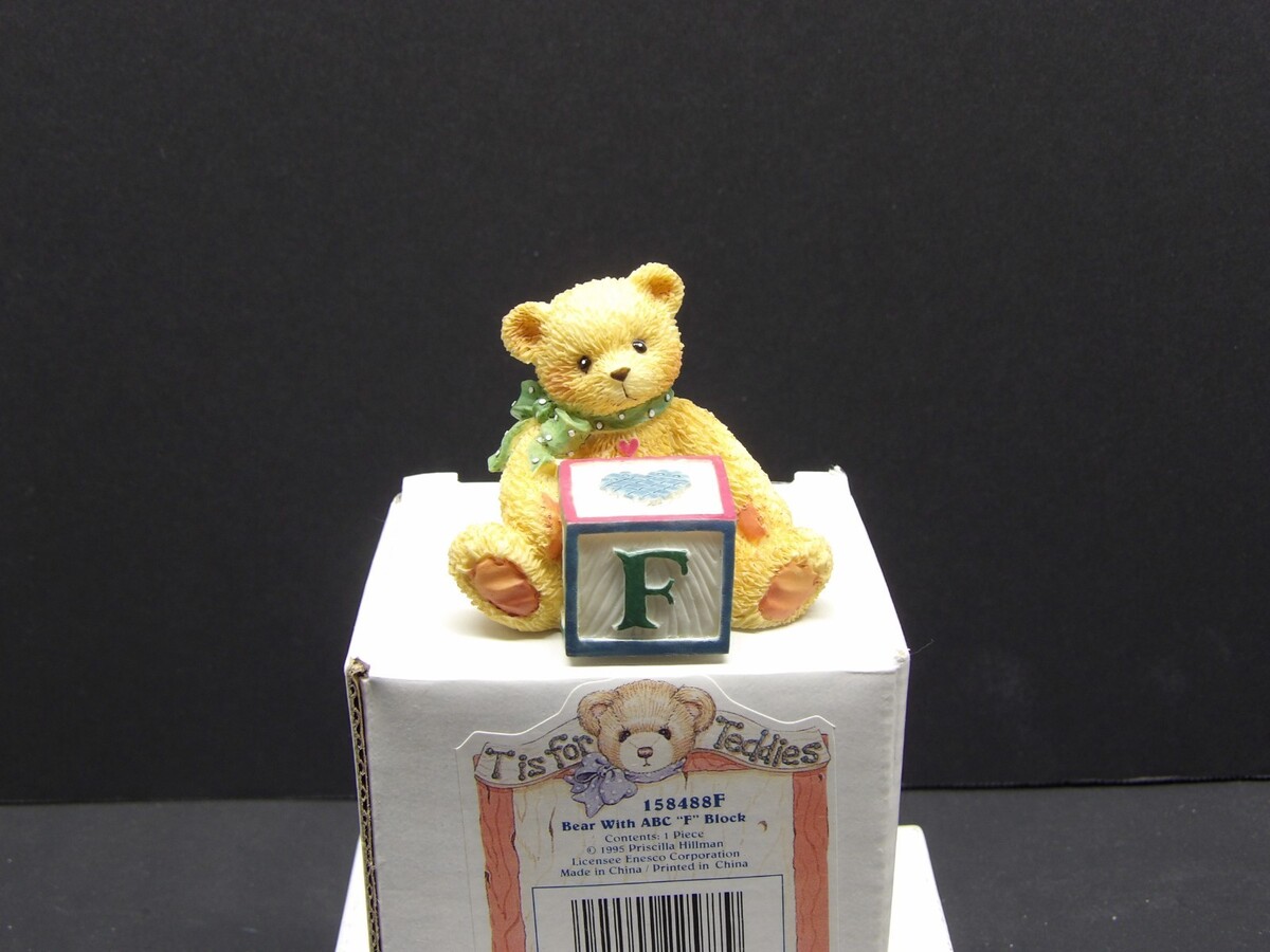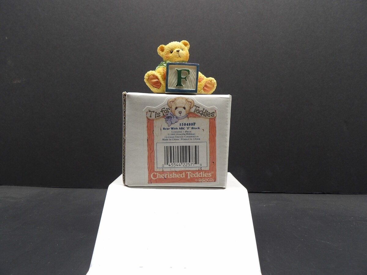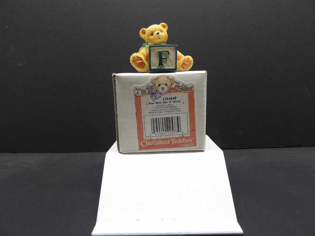 Add a sweet and colorful piece to your Cherished Teddies collection with this Vintage Cherished Teddies Bear with ABC ?F? Block, item 158488F, produced by Enesco in 1995 and designed by Priscilla Hillman. This figurine is New in Box (NIB) and includes its original packaging and label.