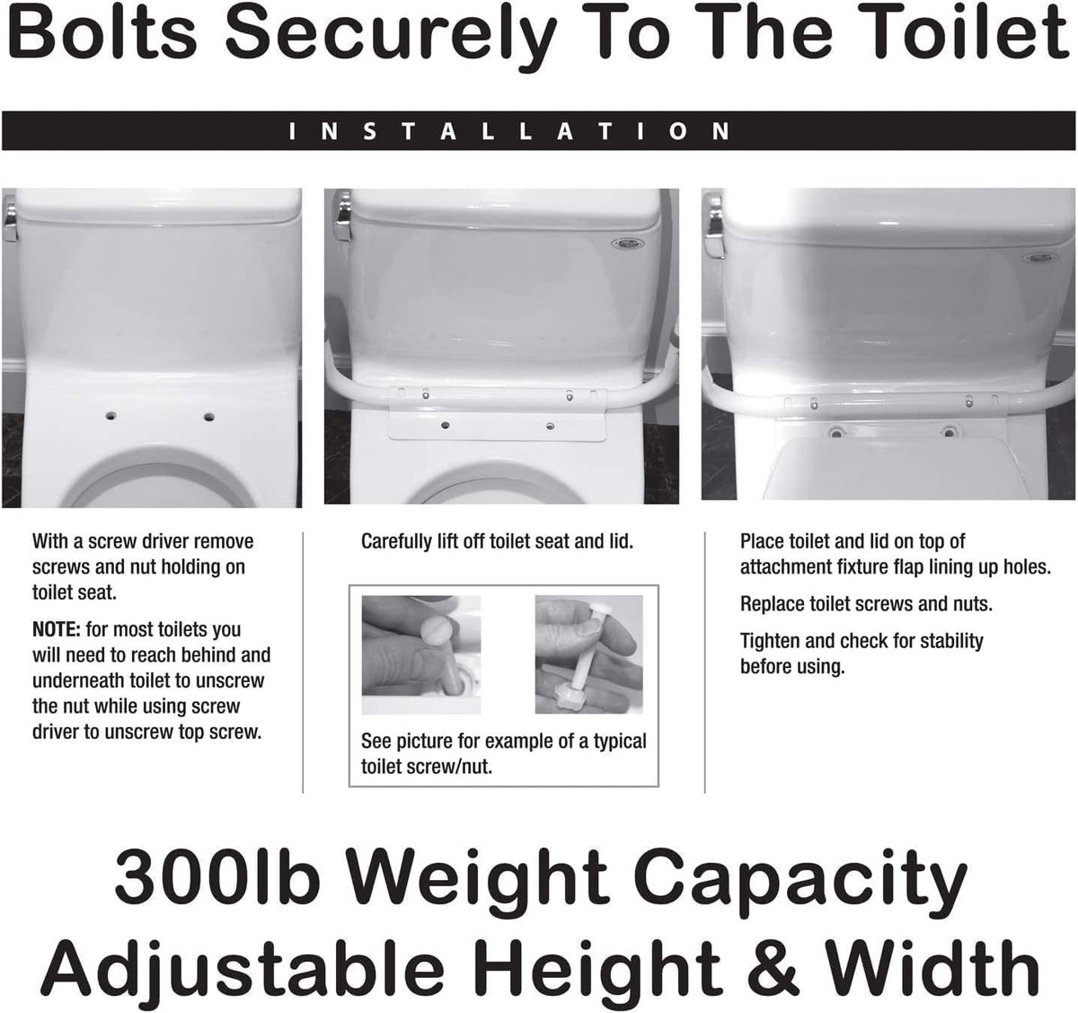 Opt for our Heavy-Duty Adjustable Toilet Safety Rails, and embrace confidence and safety with every visit to the bathroom. Invest in safety and obtain the peace of mind you deserve today!