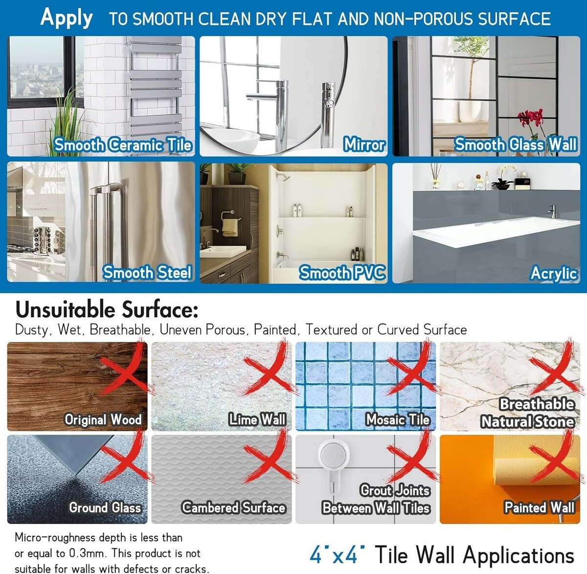 Must be applied to airtight, smooth, flat, non-porous surfaces (e.g., polished marble, standard ceramic tiles, glass, stainless steel).