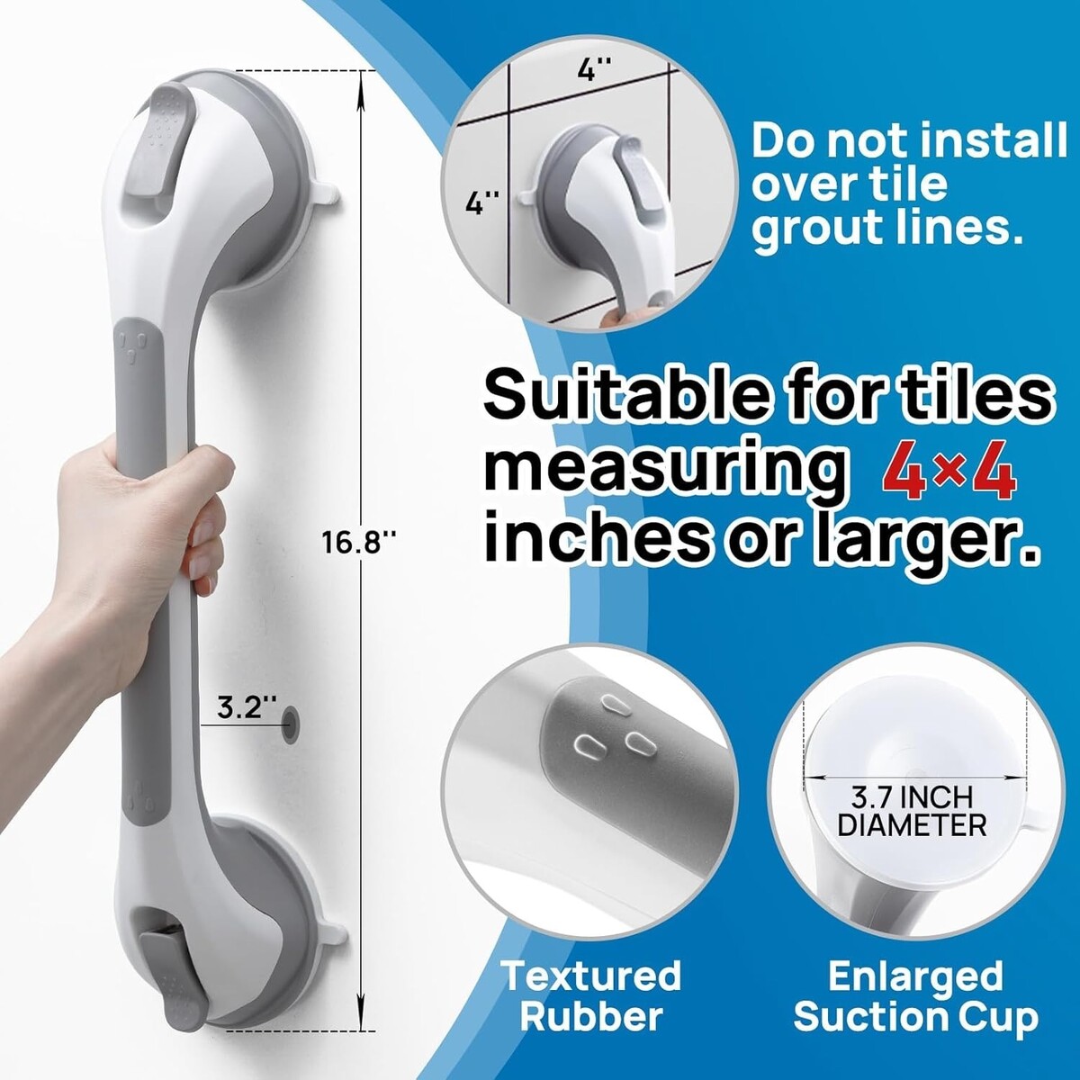 Versatile and essential safety accessory for tile bathroom walls.
