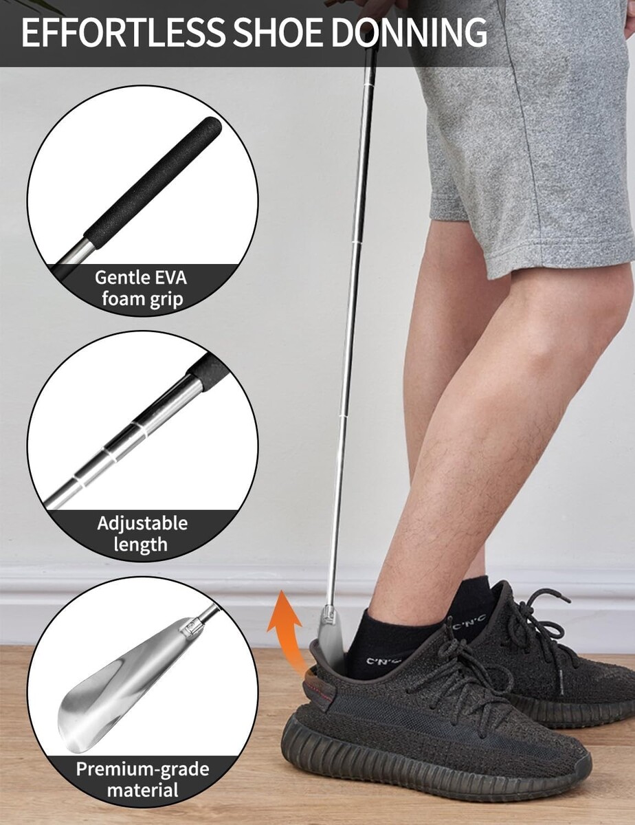 Integrated long shoe horn for seniors and a sock remover in the handle.